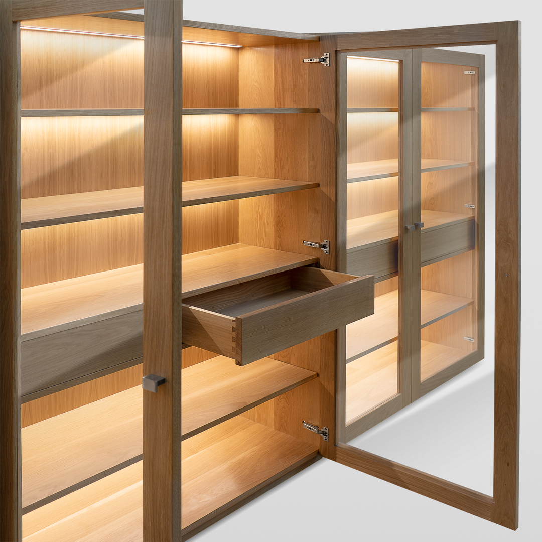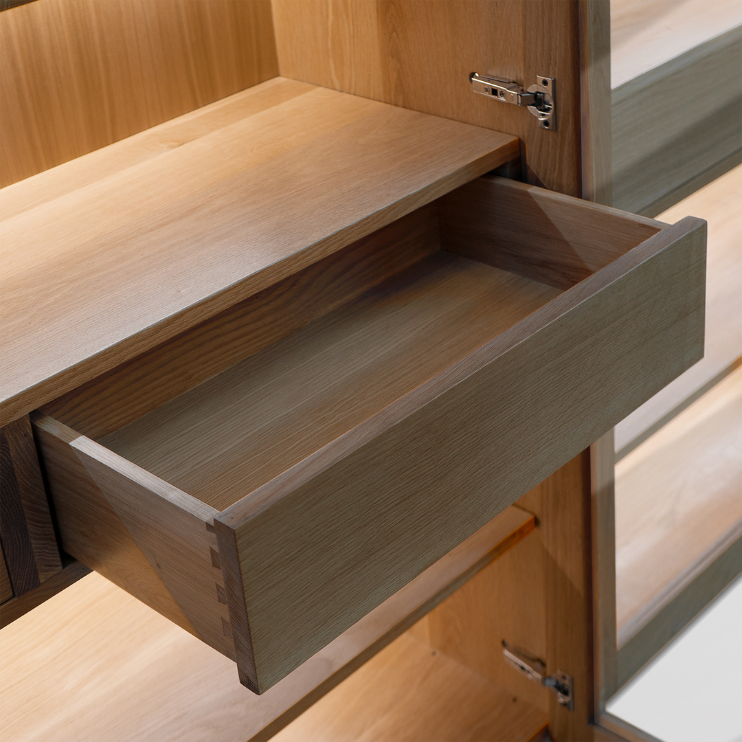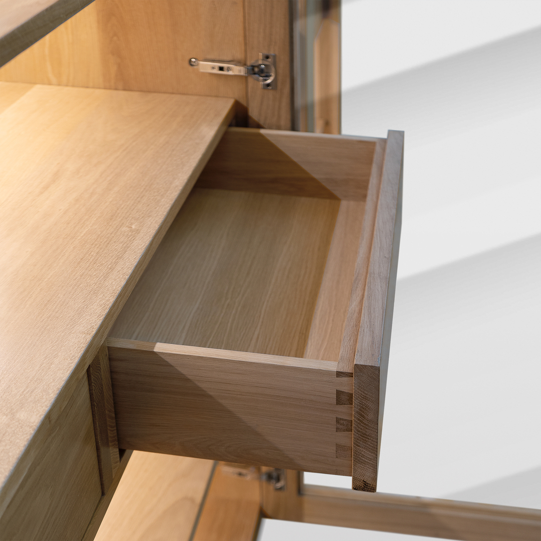 Berührungsfreie Schubladen: Ausgestattet mit hochwertigen BLUM Metallschienen und einer Schwalbenschwanz-Verbindung im Inneren, die für erstklassige Handwerkskunst und Langlebigkeit steht.