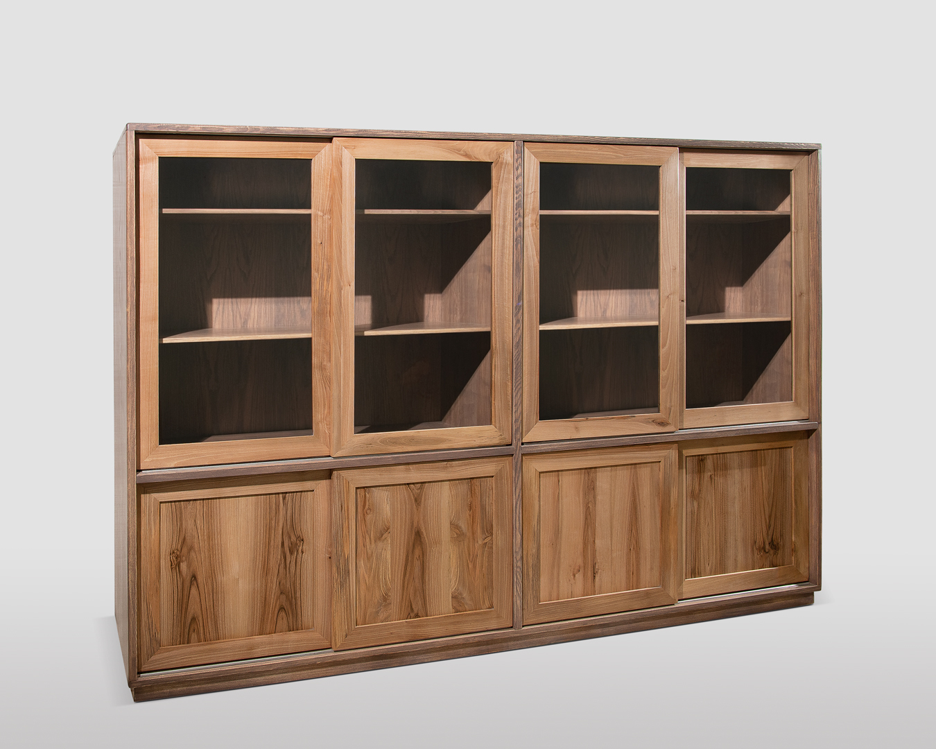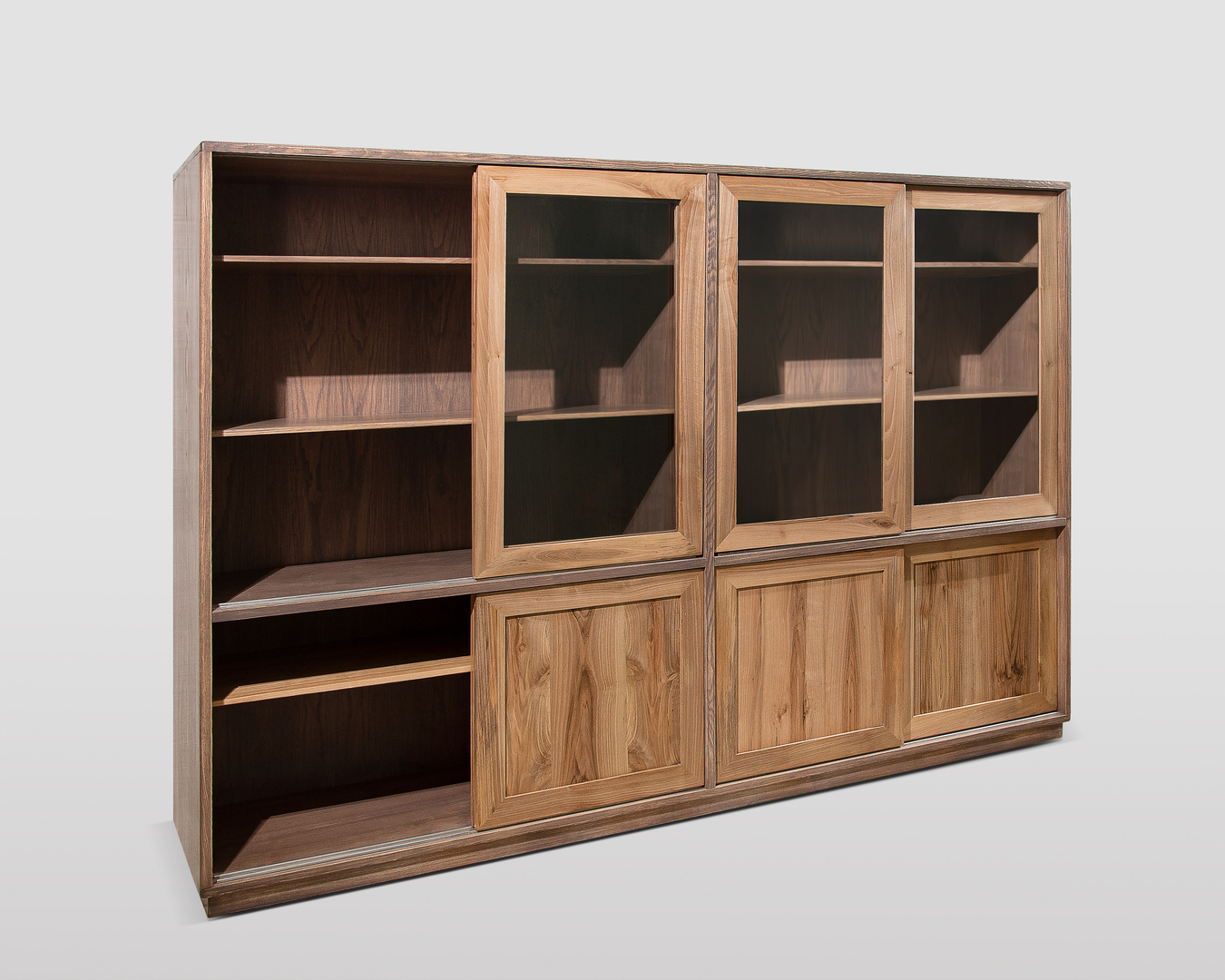 Das obere Abteil ist aus massivem Nussbaumholz gefertigt. Es ist mit vier Schiebetüren aus Glas und je Modul mit zwei höhenverstellbaren Regalbrettern aus Echtholz, hier Esche, ausgestattet.