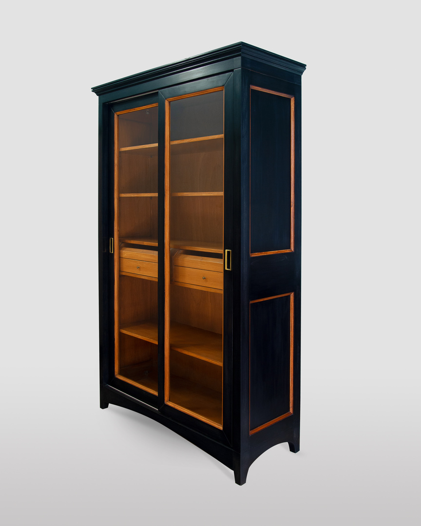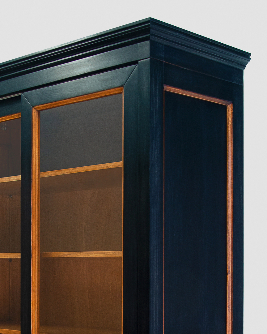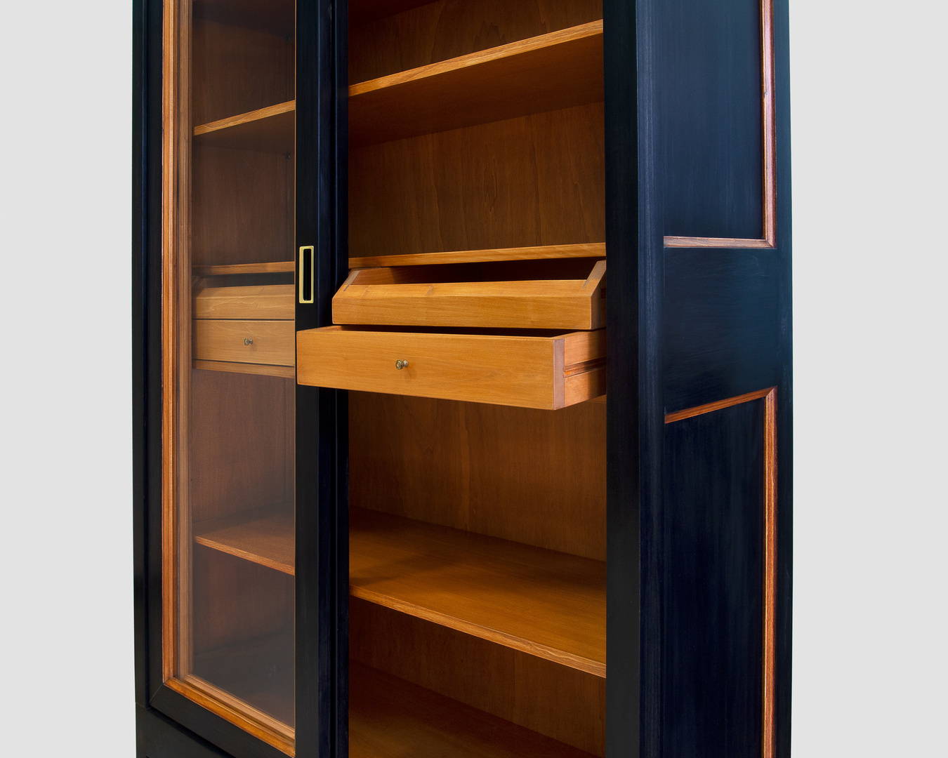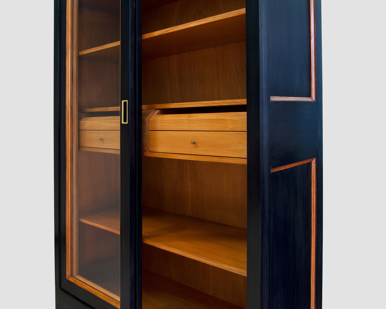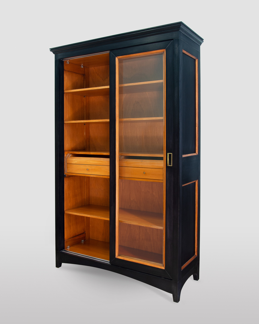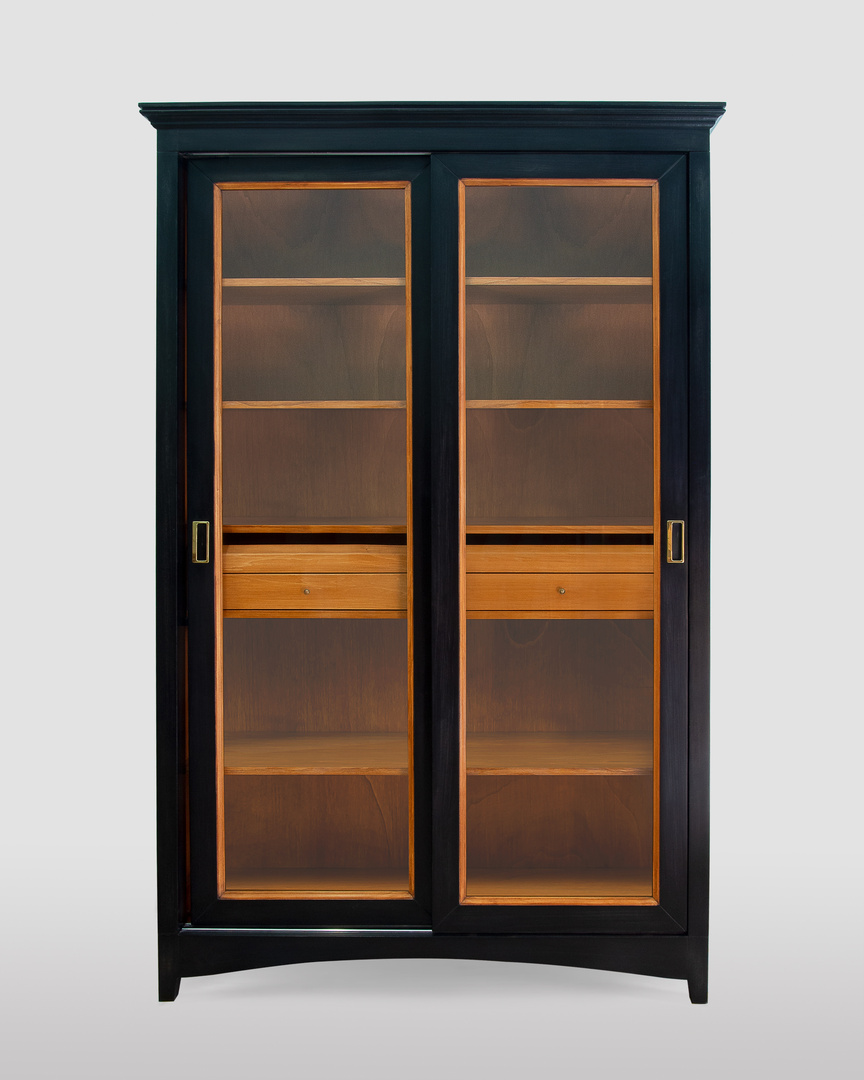 Es wurde eine Rahmenstruktur gewählt, die eine hohe Stabilität des Produktes garantiert. Die Oberseite ist durch feine und elegante Gesimse gekennzeichnet, während die Unterseite einfach geformt ist. Der Korpus besteht aus zwei Glas-Schiebetüren und geschlossenen Seitenteilen mit Holzpaneelen. Das Möbel ist schwarz gebeizt, trotzdem bleiben alle Holzmaserungen sichtbar, während die Kantenleisten im Kontrast dazu in heller Nussbaumfarbe gehalten sind. In der Mitte befinden sich vier Holzschubladen mit Schwalbenschwanz-Verbindungen sowie drei stabile Einlegeböden, die hohe Gewichte aufnehmen können und immer aus Massivholz gefertigt sind. Der Innenteil ist im Kontrast dazu in hellem Nussbaumholz gehalten. Die Lackierung ist aufgetragen mit umweltfreundlicher Farbe auf Wasserbasis, frei von giftigen Emissionen. Die Endpolitur ist selbstverständlich von Hand mit Bienenwachs ausgeführt worden. Dieses Bücherregal wird komplett zerlegt geliefert, zusammen mit einer Anleitung für eine einfache und schnelle Selbstmontage. Wir können diesen Artikel in verschiedenen Größen, Holzarten und Farben herstellen.