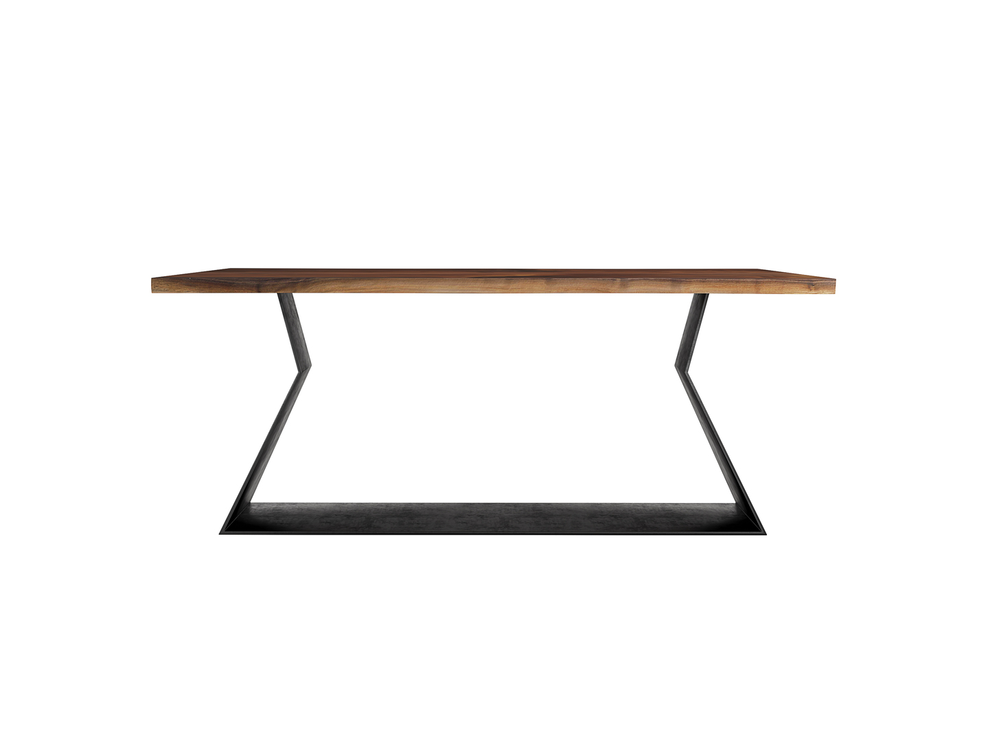 Tisch mit modernem Design, hergestellt aus zwei verschiedenen Materialien: Massivholz und Metall.