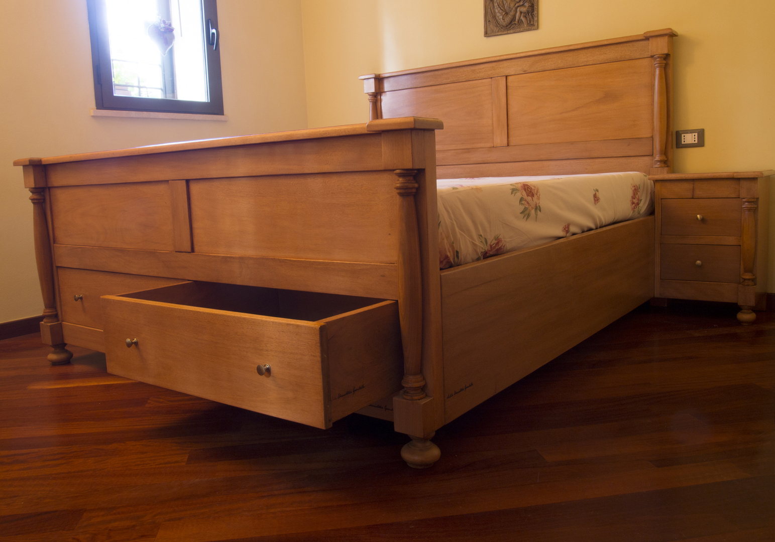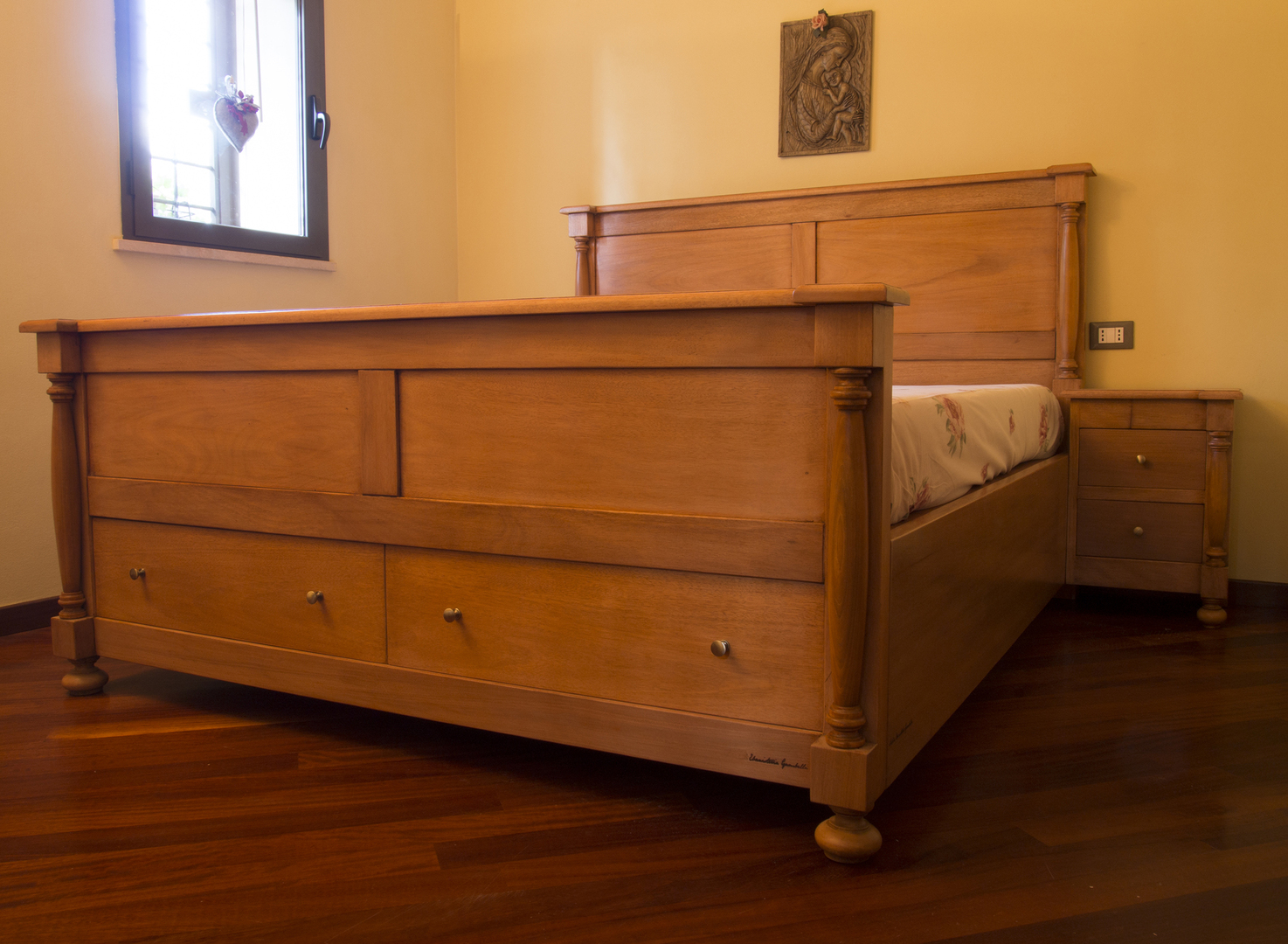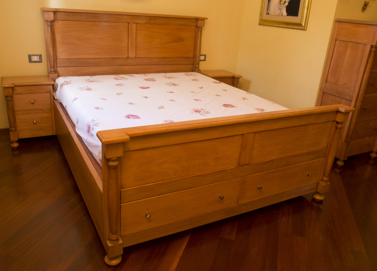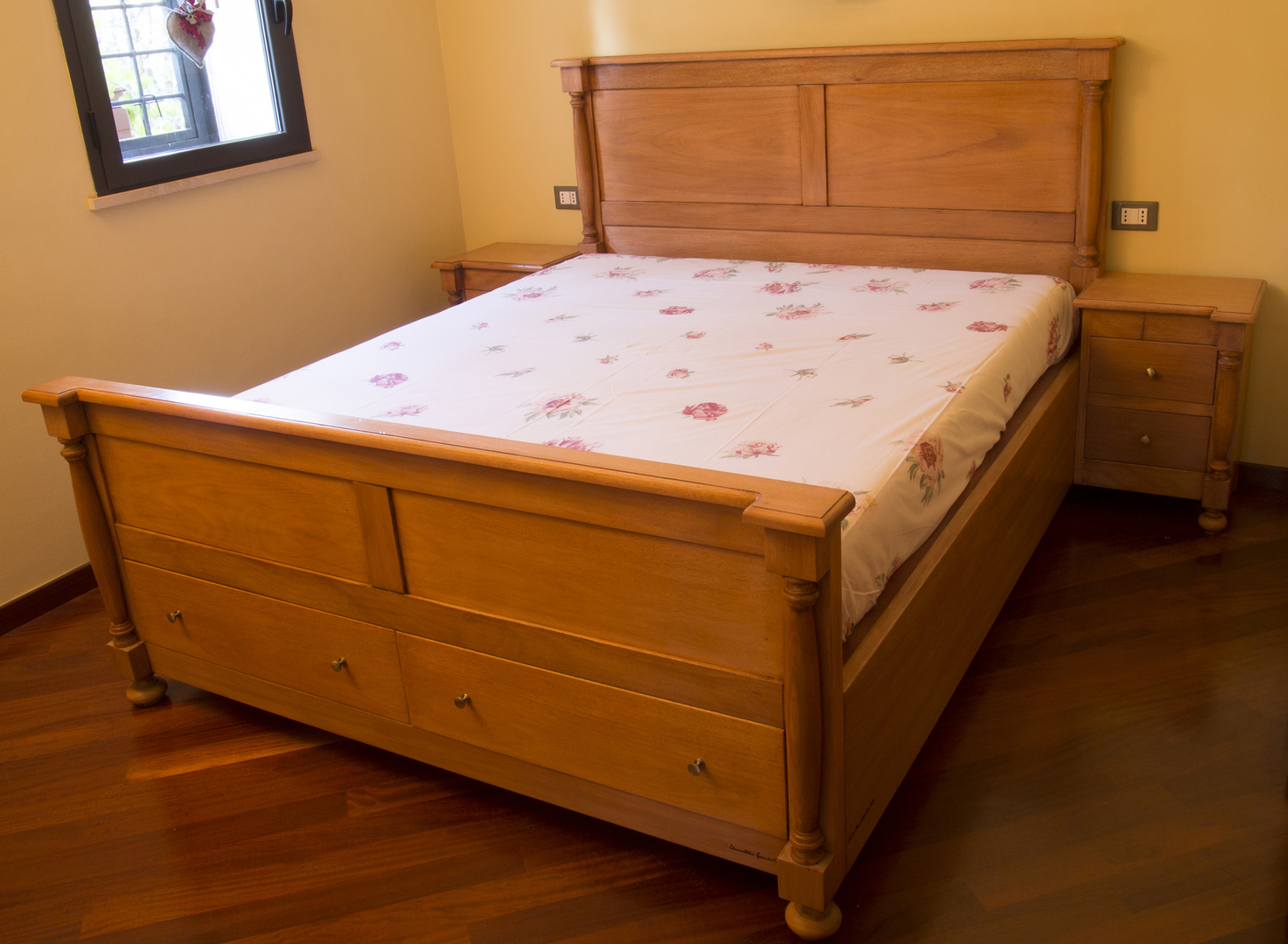 Doppelbett mit Nachttischen in klassischem Stil komplett aus massivem Okumè Holz. Handgefertigt, auch die Verzierungen sind von Hand realisiert.