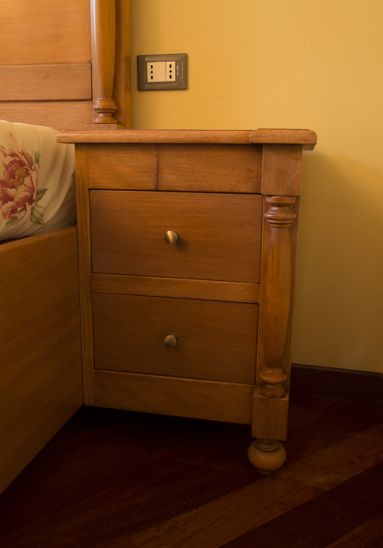 Zwei Nachttische sind am Kopfende des Bettes angebracht, jeweils mit zwei Schubladen und gedrechselter Säule. Kopfende mit Gestell und gedrechselten Säulen.