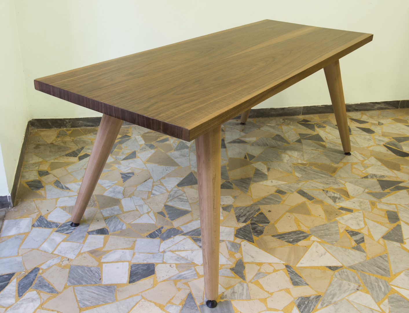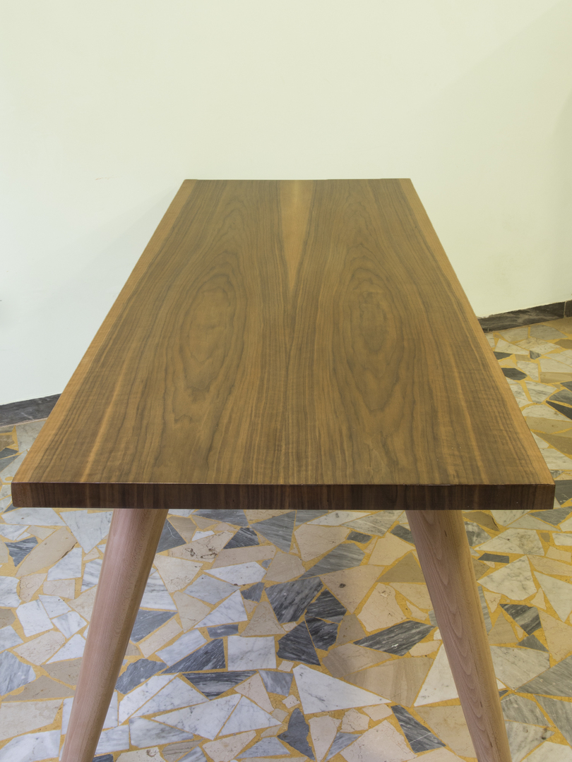Moderner Tisch im Stil der 50er-Jahre aus massivem Nussbaumholz. Es handelt sich um eine erlesene Verarbeitung, welche zur Gänze in Italien erzeugt wurde. Konische Beine aus Buchenholz mit Nivellierungsvorrichtungen können Bodenunebenheiten ausgleichen. Darüber hinaus haben wir eine spezielle Technik für die Höhenverstellung der Beine installiert. Der Tisch ist in glänzende Politur ausgeführt, die von Hand mit Schellack aufgebracht wurde. Dieses Möbel wird zerlegt geliefert, zusammen mit einer Anleitung für eine einfache und schnelle Selbstmontage.