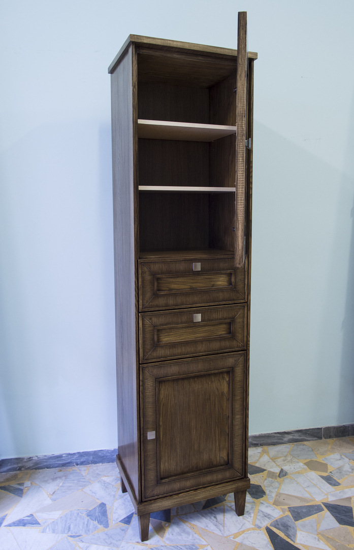 Kleiderschrank für das Badezimmer aus Eschenholz. Handgefertigt, auch die Verzierungen sind von Hand realisiert.