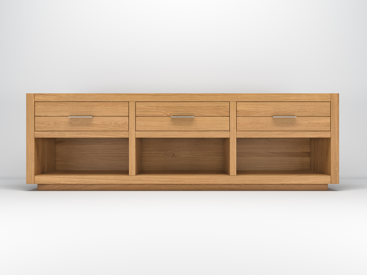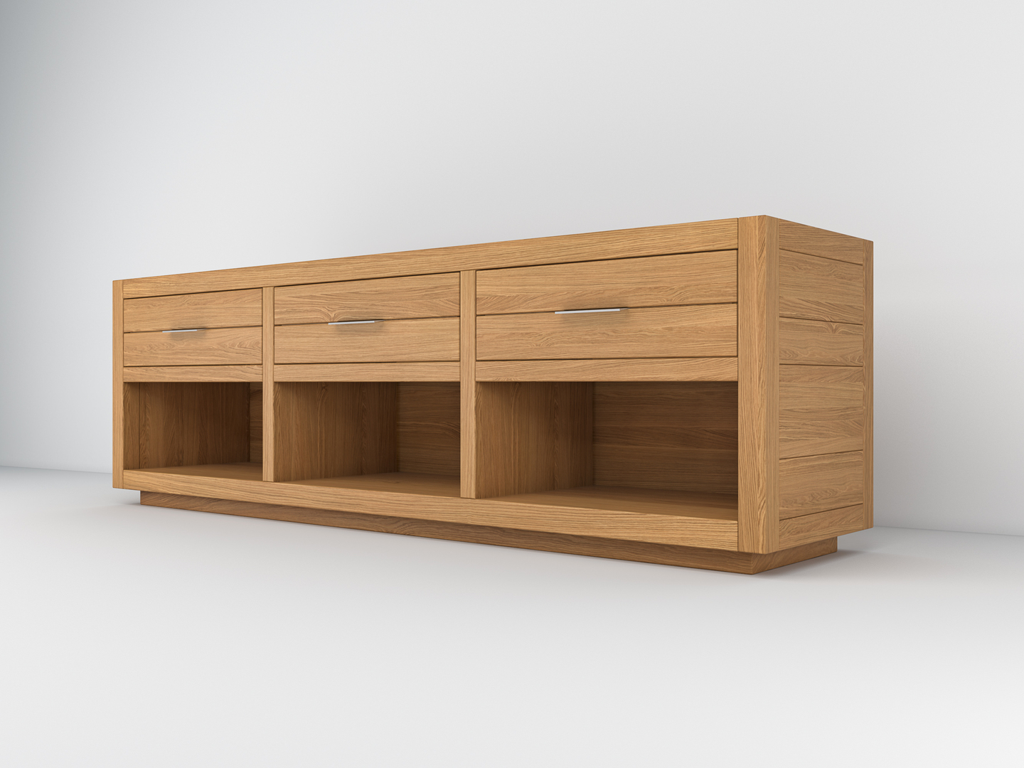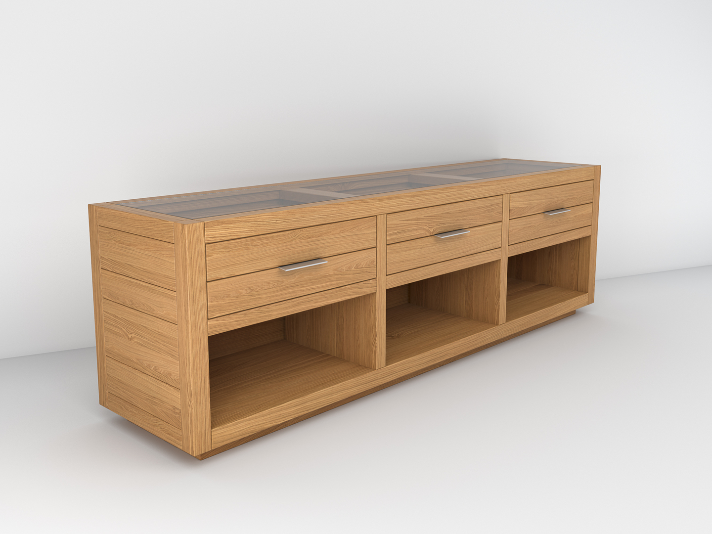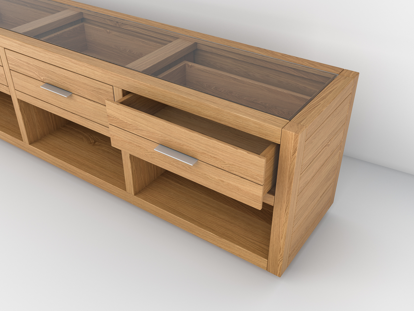 Tv-Möbel aus Eichenholz mit minimalem Design und Top aus Glas. Handgefertigt, auch die Verzierungen sind von Hand realisiert.