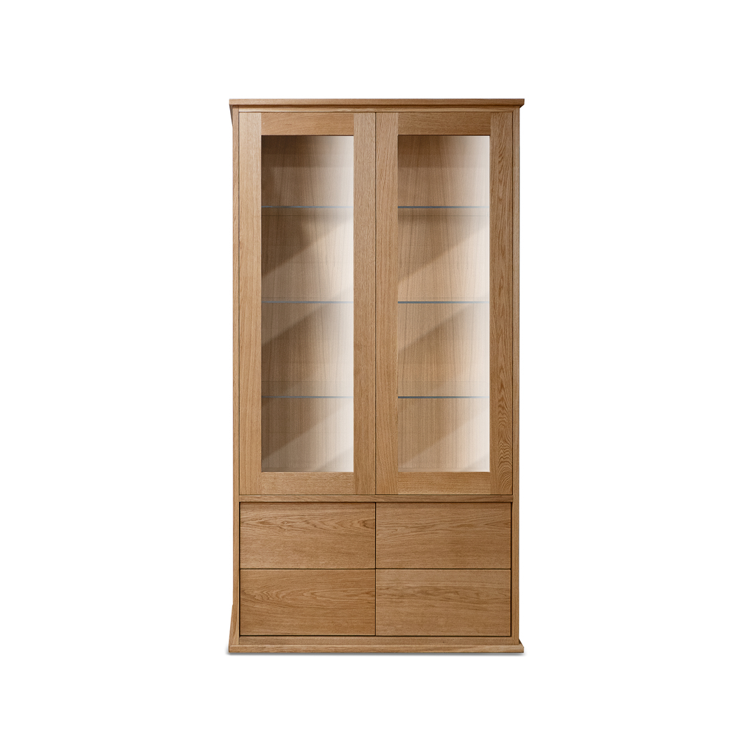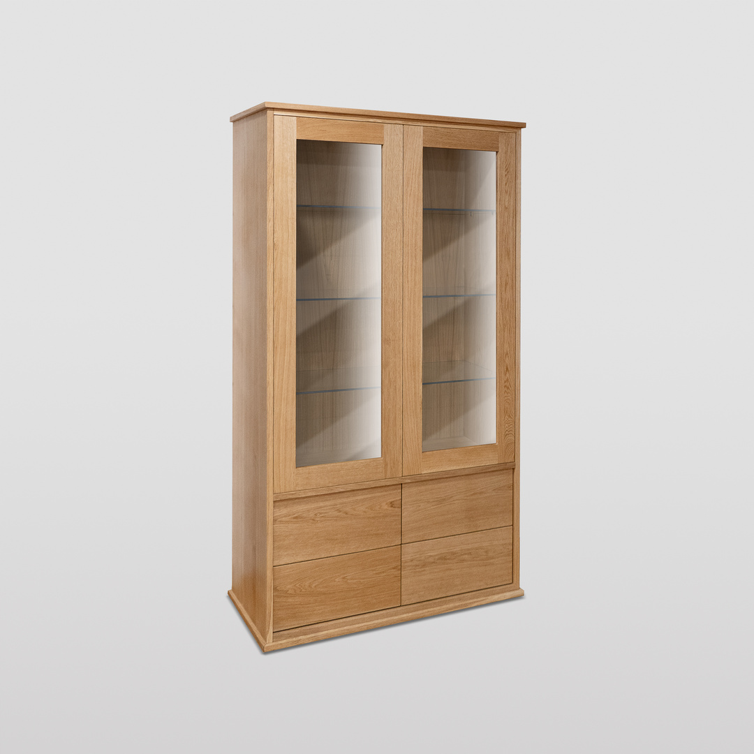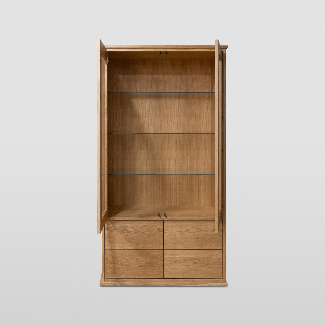 Vier geräumige Schubladen, gefertigt mit handwerklich präzisen Schwalbenschwanzverbindungen, ergänzen die Struktur und bieten verdeckten Stauraum für weniger dekorative Gegenstände. Die umweltfreundliche Öl-Oberfläche betont die warmen, natürlichen Töne der Eiche und macht diesen Schrank zu einem vielseitigen Möbelstück, das sowohl in modernen als auch in traditionellen Innenräumen zur Geltung kommt.