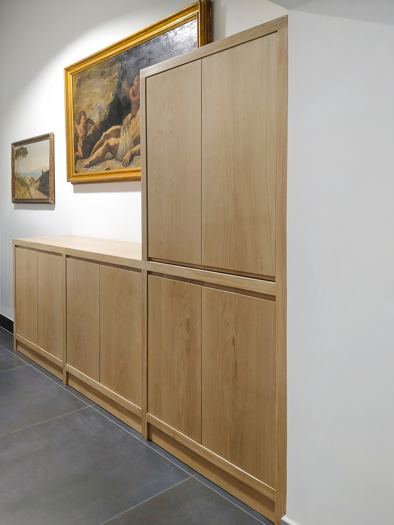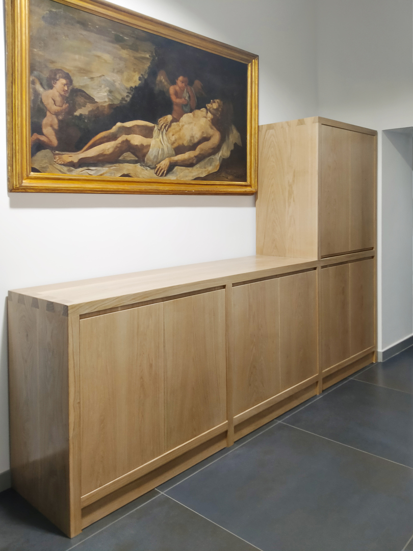 Dieser maßgefertigte Aufbewahrungsschrank aus massivem europäischem Eichenholz vereint perfekt anspruchsvolle Ästhetik und Funktionalität. Er wurde speziell für die Bedürfnisse der Aufbewahrung entwickelt und ist ideal, um Dokumente, Ordner und größere Gegenstände zu verstauen und gleichzeitig für Ordnung und Eleganz im Raum zu sorgen.