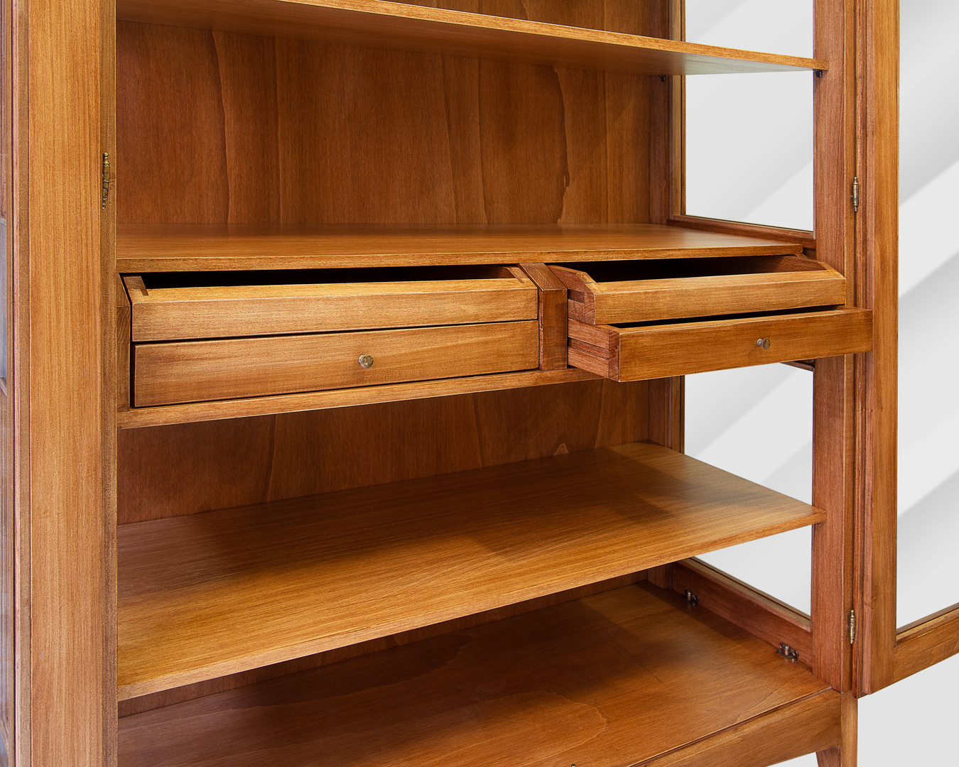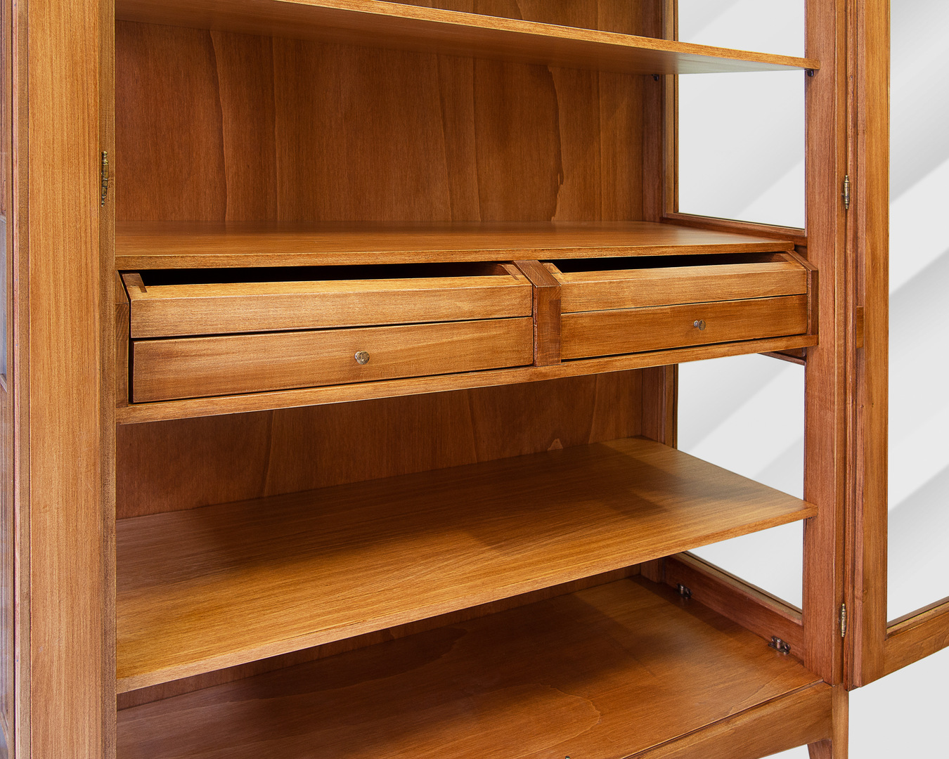 Zwei Türen aus Glas. Das Türschloss hat einen Doppelhaken, der die Türen am Möbel festhält, um Verbiegungen im Laufe der Zeit zu vermeiden. Seiten aus Glas mit angebrachten Rahmen.
