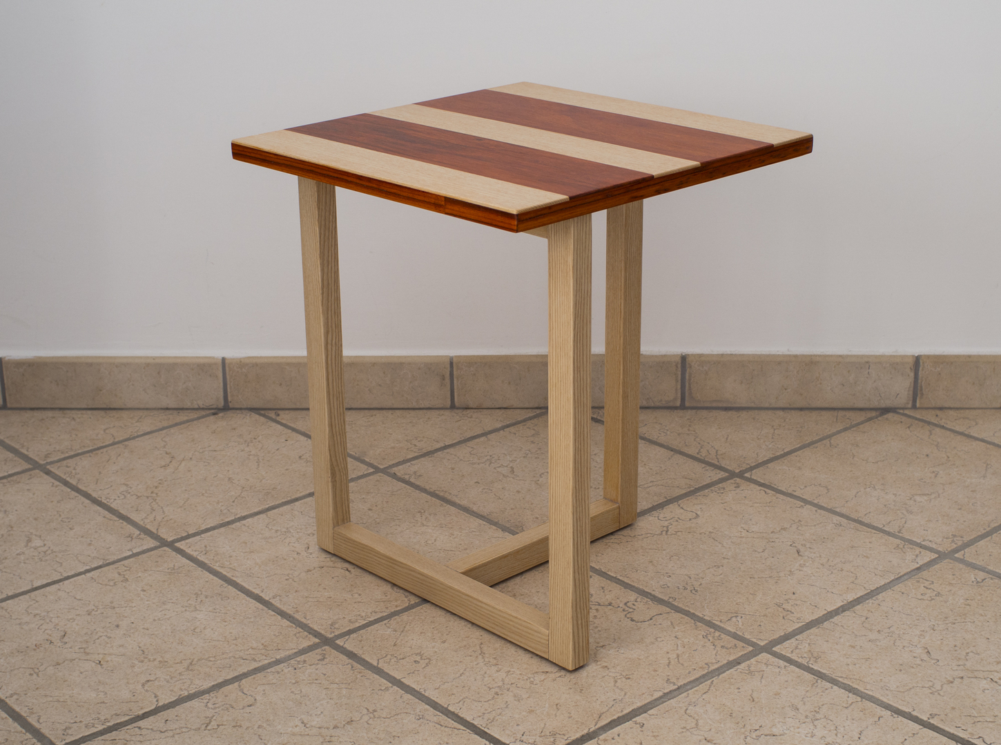 Die Oberefläche ist aus Eschenholz mit Streifen zum Kontrast aus Padouk. Wenn die Couchtische nährergebracht werden, erschaffen ihre Größen ein elegantes Formenspiel.