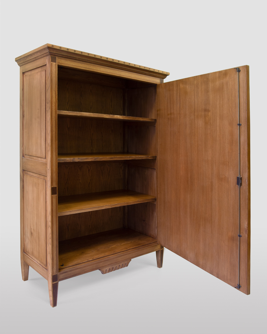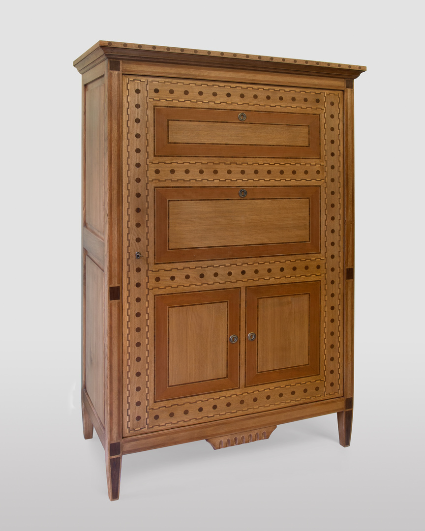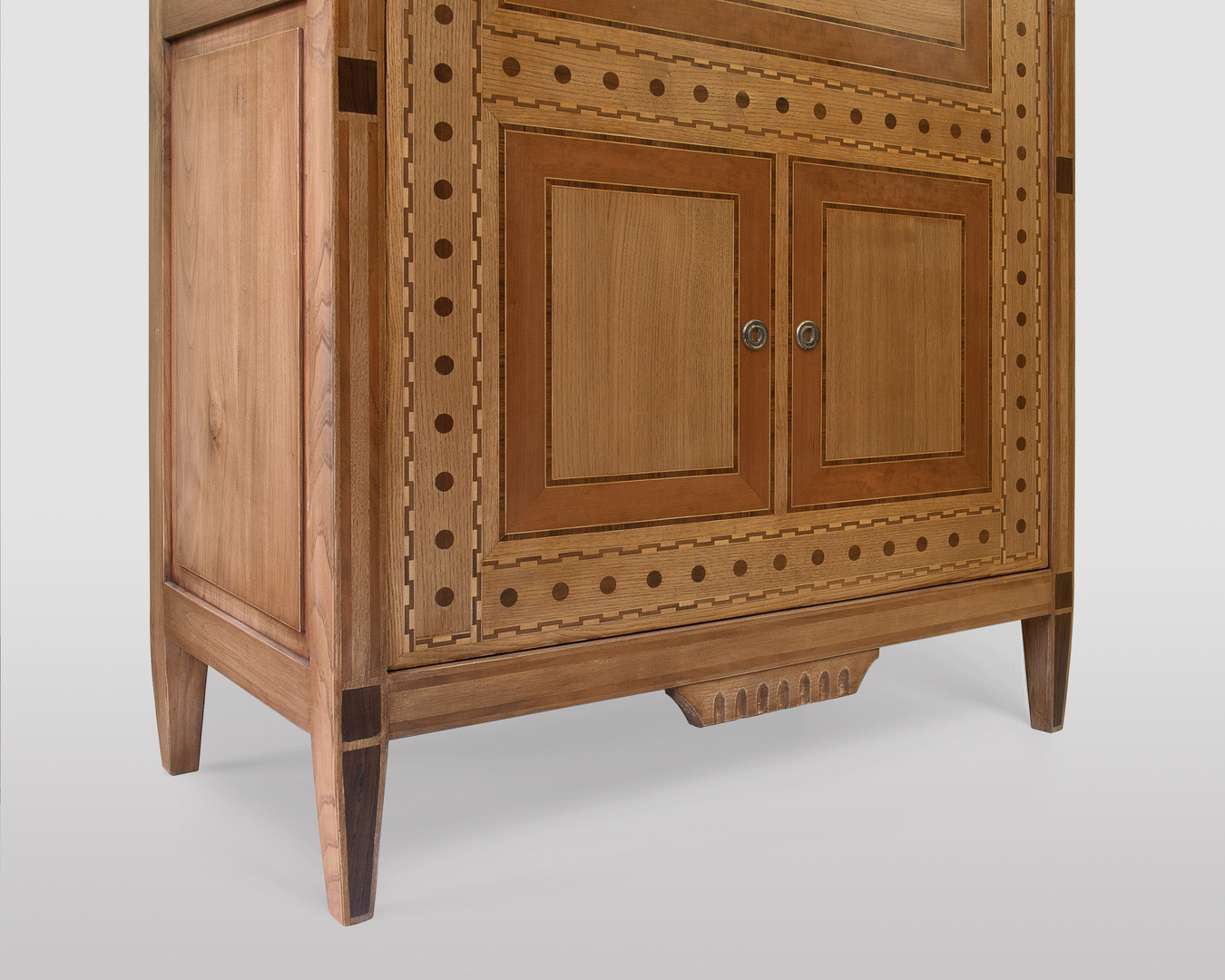 Hauptmerkmal ist die einzelne Vordertüre, bei der mit einer kunstvollen, akribischen Einlegearbeit die optische Illusion von vier Türen, zwei mit zu öffnenden Klappen und zwei Standardtüren, geschaffen wurde. Die Intarsien der Fronttüre haben eine geometrische Form, die durch die Kombination von zwei verschiedenen Holztönen, hell und dunkel, erzielt wurde und einen faszinierenden Farbkontrast skizziert. Die Struktur des Schrankkörpers ist in Rahmentechnik gebaut, um die notwendige Solidität und Robustheit des Möbelstücks zu gewährleisten. Die Vordertür ist mit einem doppelten Hakenschloss ausgestattet, das die richtige Stabilität gewährleistet, einem möglichen Verbiegen des Gestänges im Lauf der Jahre vorbeugt und immer ein perfektes Schließen ermöglicht. Die Seiten sind aus rechteckigen und massiven Kastanienholzplatten gefertigt. Pyramidenförmige Beine mit feinen geometrischen Einlegearbeiten kontrastieren mit hellem und dunklem Holz. Der Sockel besticht durch eine elegante, geschnitzte Applikation. Das Innenleben ist mit drei höhenverstellbaren Holzablagen ausgestattet. Dieses Schmuckstück ist lackiert mit umweltfreundlicher Farbe auf Wasserbasis, frei von giftigen Emissionen und erhielt eine von Hand aufgetragenen Endpolitur mit Bienenwachs. Dieser Schrank wird zusammengebaut geliefert, daher ist keine Montage erforderlich.