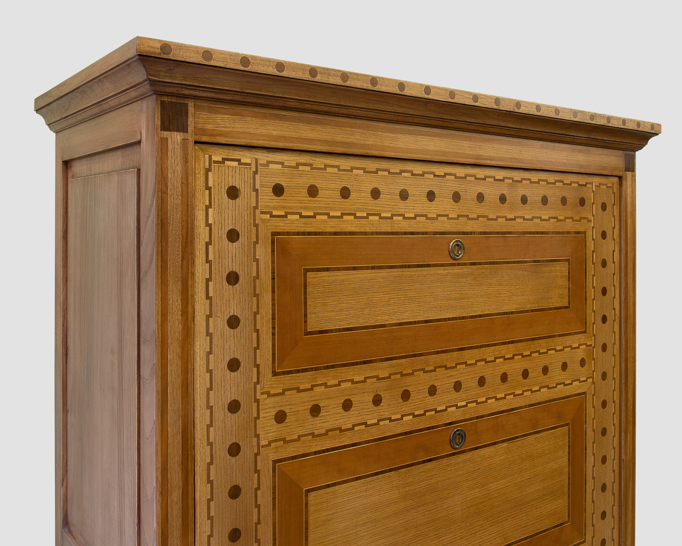 Ein einzigartiges Meisterwerk der Holzbearbeitung. Massiver Kastanienschrank mit Intarsien, Erlesene Handarbeit, zur Gänze in Italien gefertigt.