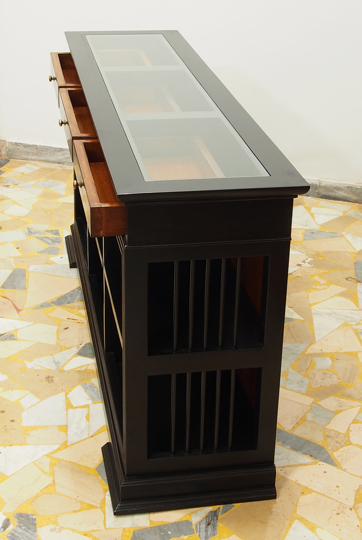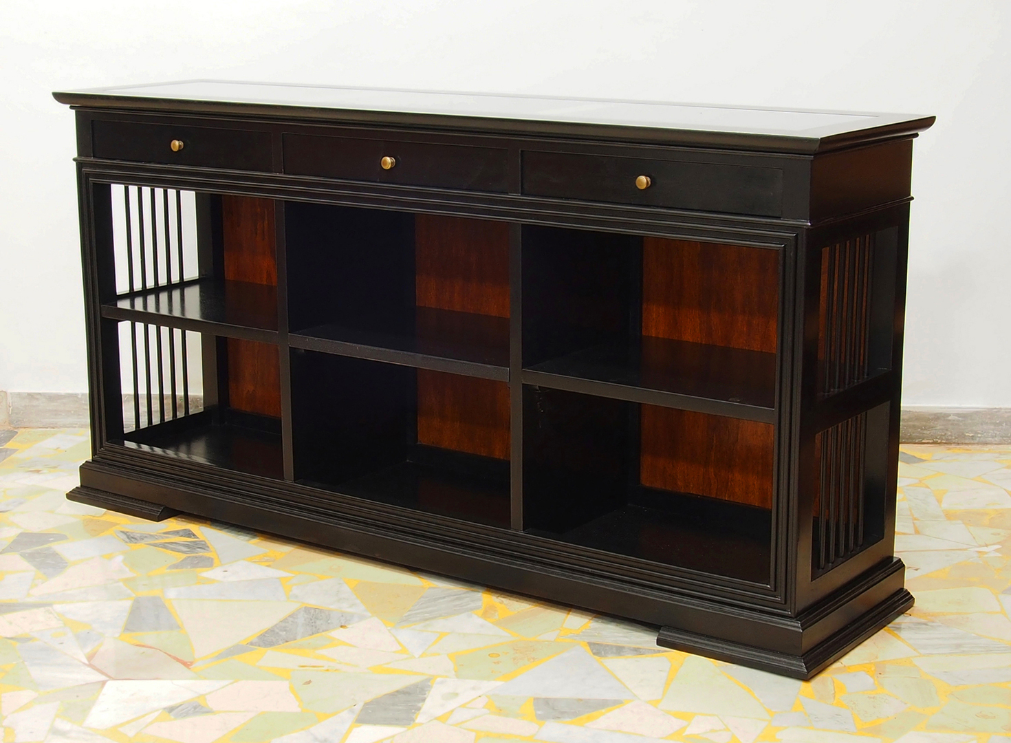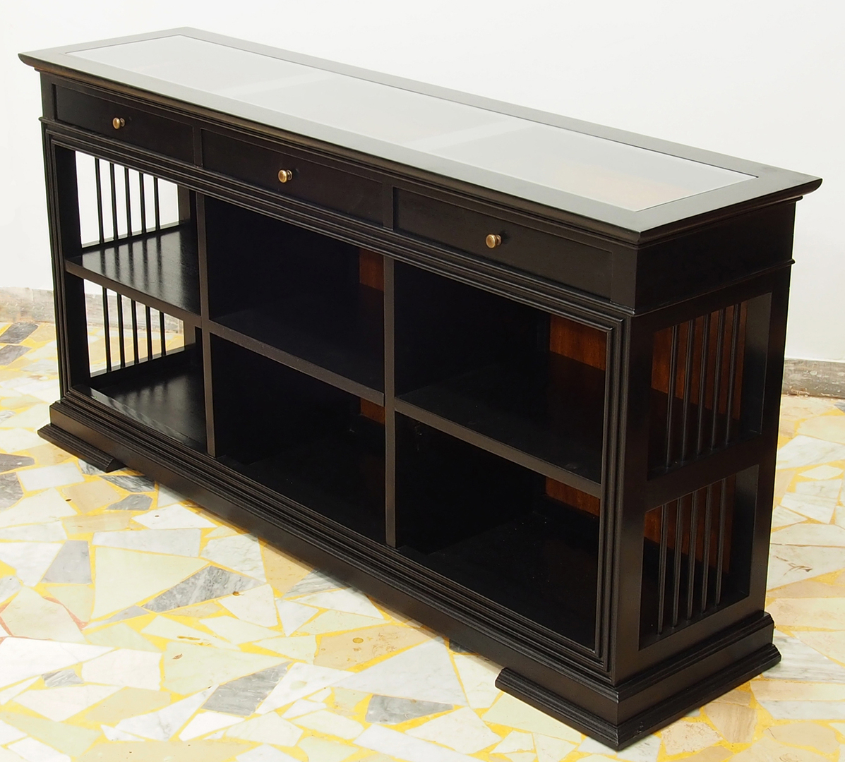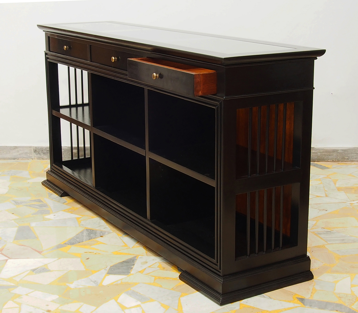 Das TV-Möbel hat aus Mahagoni Massivholz realisiert. Es besitzt eine Tischplatte aus Glas, drei Schubladen und sechs offene Fächer in Sicht. Die Außenfläche wird schwarz lackiert; der innere Teil in Nussbaum Farbe getönt wird.