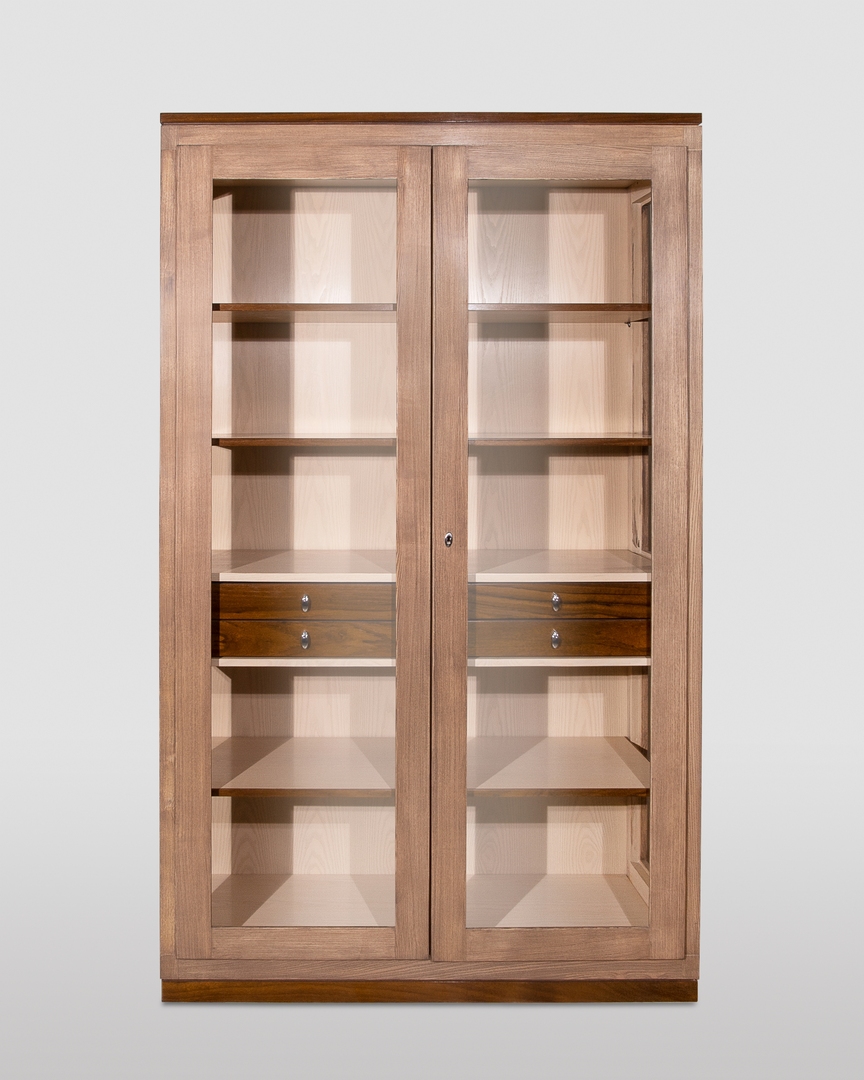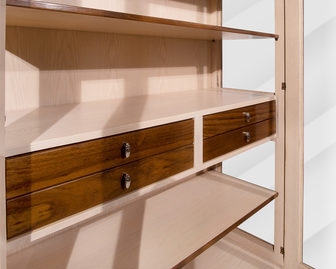 In der Mitte ist die Vitrine mit vier Schubladen ausgestattet, ein markantes Element in massivem Daniela-Nussbaumholz, zusätzlich verziert durch Designer-Metallknäufe. Innen sind die Schubladen aus Massivholz und mit Schwalbenschwanzverbindungen und Holzführungen versehen.