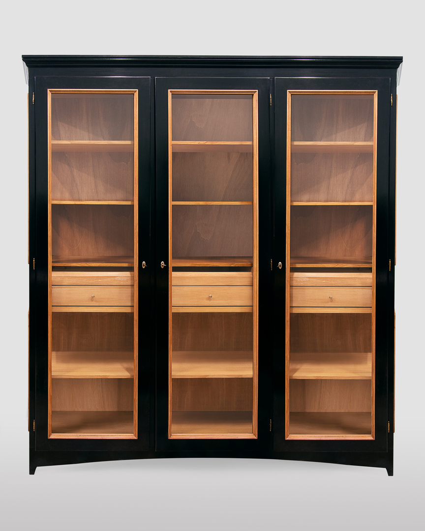 Drei Glastüren, die mit einem doppelten Hakenschloss ausgestattet sind, oben und unten, um einen stets perfekten Verschluss und eine hohe Stabilität zu garantieren, damit es im Lauf der Zeit zu keiner Verbiegung kommt. Die in den Rahmen gebauten Glasseiten garantieren die notwendige Solidität und Robustheit der Vitrine. Im Mittelteil befindet sich ein Element mit sechs Schubladen aus massivem Tulpenholz, die mit Schwalbenschwanz-Verbindungen versehen sind.