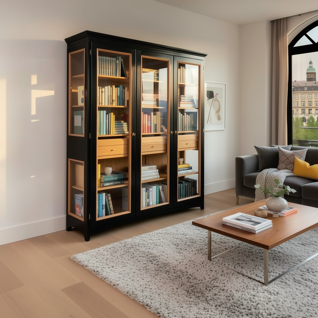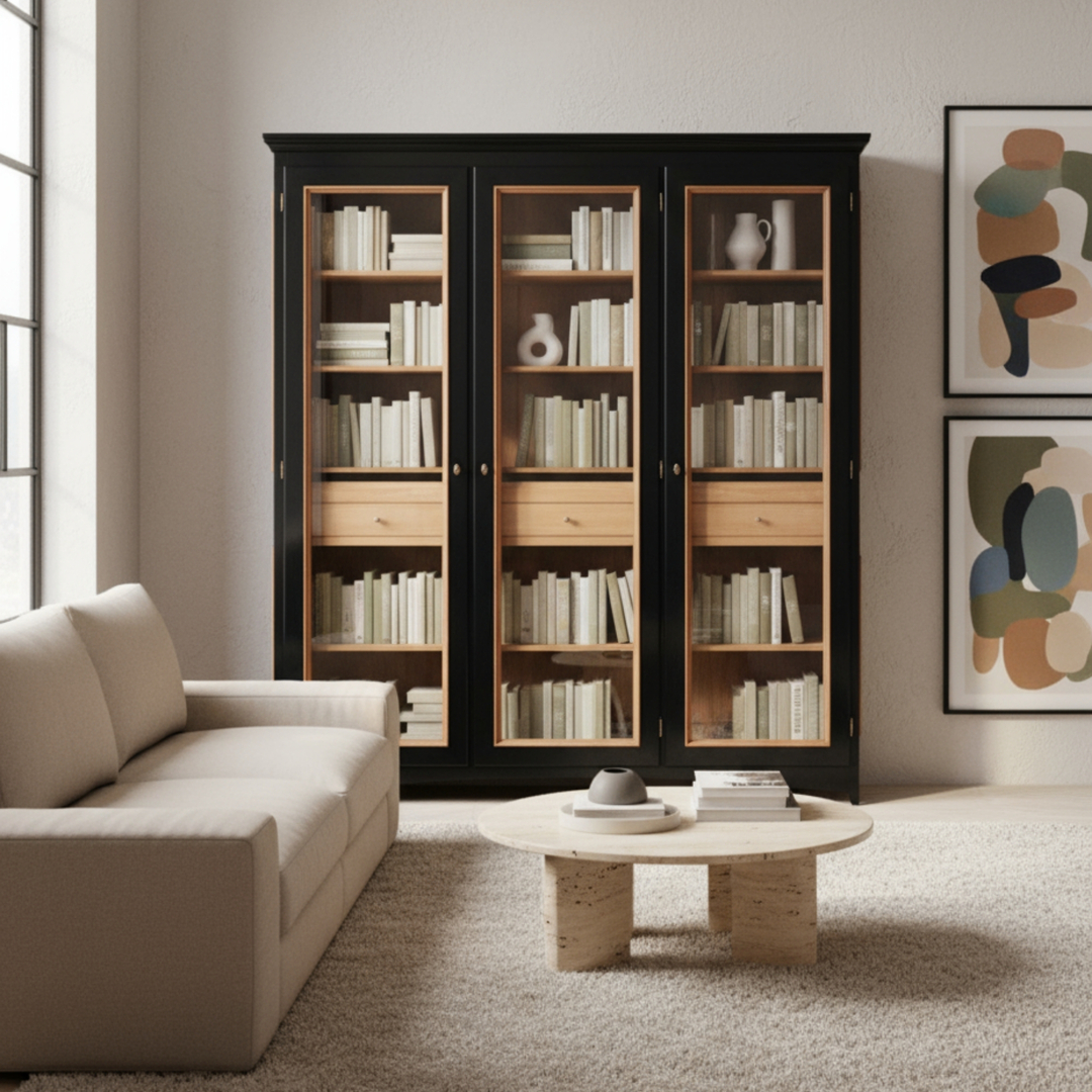 Dreitürige Vitrine aus massivem Tulpenholz. Erlesene handwerkliche Fertigung, mit besonderer und sorgfältiger Beachtung aller Details, zur Gänze in Italien erzeugt.