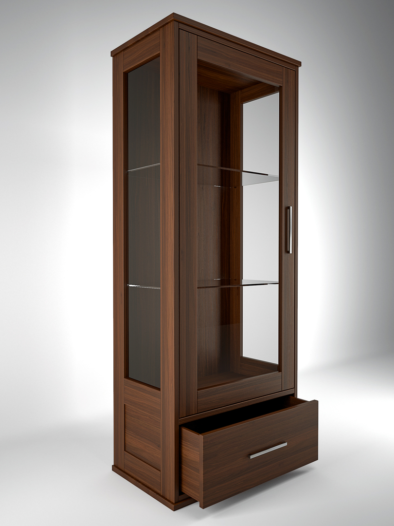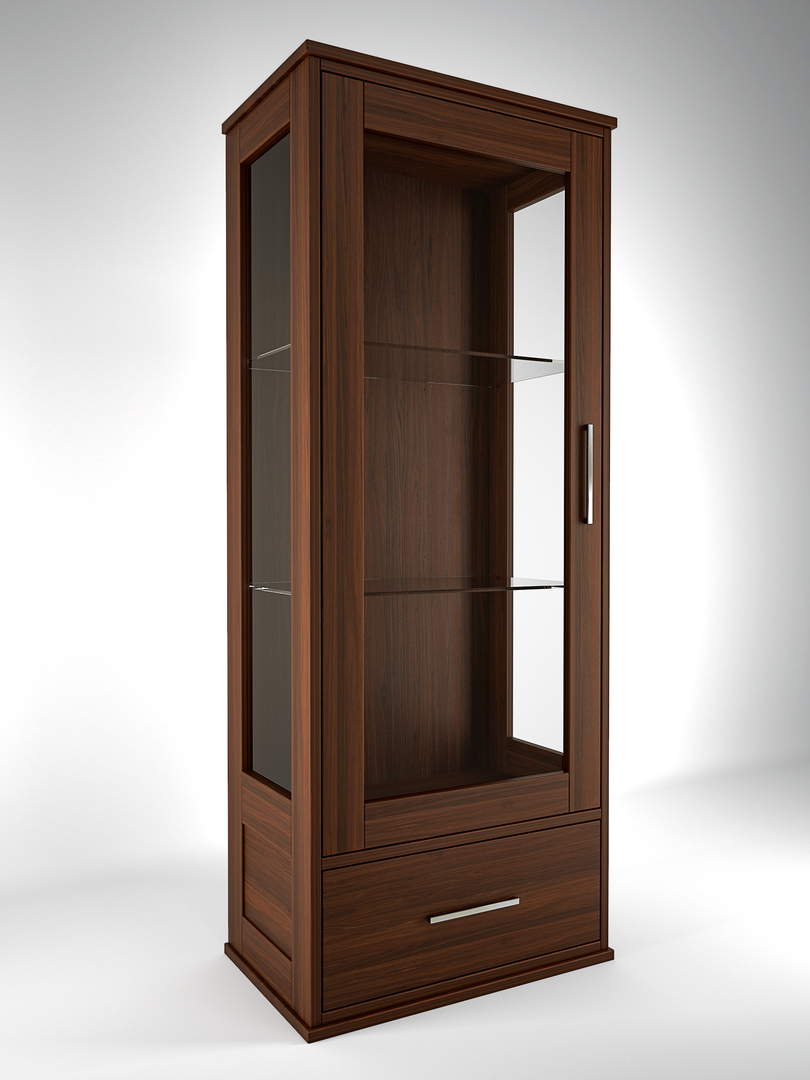Schrank im Minimalstil, vollständig aus massivem „Daniela-Nussbaum“ gefertigt. Erlesene Verarbeitung, mit präziser und sorgfältiger Liebe zum Detail, zur Gänze gefertigt in Italien. Ausgezeichnet wird dieser Schrank durch ein einfaches und schlichtes Design mit einer klaren und einfachen Form. Die Glastür ist mit einem Edelmetallgriff verziert und mit weich schließenden Scharnieren ausgestattet. Die Seiten sind mit Glas, das im Rahmen gebaut ist, und an der Unterseite mit einer Holzplatte gefertigt, um die notwendige Robustheit und Haltbarkeit zu garantieren. Das Innenfach verfügt über zwei, höhenverstellbare Glasböden. Im Sockel ist eine mit einem Metallgriff verzierte Schublade verbaut, die mit Schwalbenschwanz-Scharnieren und versteckten Metallschienen der Marke Blum versehen ist. Diese Metallschienen zeichnen sich durch vollständige Öffnung, hohe Belastbarkeit und vor allem durch das berühmte Dämpfungssystem „Blumotion“ aus. Ein zusätzliches Merkmal des Sockels sind die versteckten, von innen verstellbaren Nivellierungsvorrichtungen, die es ermöglichen, die Bodenfläche auszugleichen und eventuell vorhandene Lücken zu schließen, um eine optimale Stabilität zu erreichen. Die Lackierung ist in Natur gehalten, aufgetragen mit Farbe auf Wasserbasis, frei von giftigen Emissionen. Die Endpolitur ist selbstverständlich von Hand mit Bienenwachs ausgeführt worden, womit eine wunderbar satinierten Matteffekt und eine weiche Oberfläche erzeugt werden. Der Schrank wird bereits zusammengebaut geliefert, sodass keine weiteren Arbeiten erforderlich sind. Wir können diesen Artikel in verschiedenen Größen, Holzarten und Polituren herstellen.