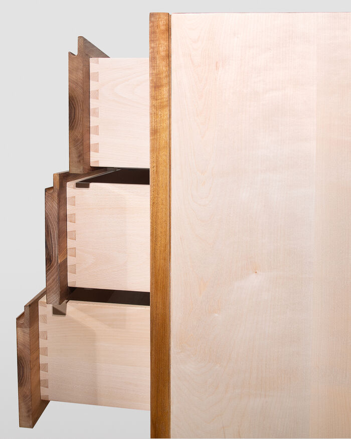 Kleiderschrank aus massivem Holz mit drei Schubladen, hergestellt aus zwei hochwertigen Hölzern: Nussbaum und Ahorn. Handgefertigt mit handwerklichen Bearbeitungen und Verarbeitungen. Moderne und lineare Gestaltung mit einfachen Linien, typisch für den minimalistischen Stil. Basis aus Nussbaum mit pyramidenförmigen Füßen. Die Front ist mit einem geometrischen Abschnitt versehen. MATERIALIEN: Gestell aus massivem Ahorn, Schubladenfronten aus nationalem Nussbaum. TECHNISCHE DETAILS: Schubladen mit Stubenwangenverbindungen hergestellt, ohne Griffe, um die Schönheit dieses seltenen und wertvollen Holzes zu bewahren. Das Öffnen wird durch fein bearbeitete Rinnen in der Oberseite der Fronten ermöglicht. Ausgestattet mit versteckten metallischen Führungen der Marke BLUM, die durch eine sehr hohe Belastbarkeit, vollständige Entnahme und verlangsamte Schließung Blumotion gekennzeichnet sind. LACKIERUNG: Ausgeführt mit umweltfreundlichen Wasserbasislacken und endgültiger Wachsglanz, um ein zusätzliches Pracht-Element hinzuzufügen, dank ihres verführerischen satinierten Matt-Effekts. Die Schubladenfronten werden von Hand poliert, mit Schellack, um ein glänzendes Aussehen zu verleihen und einen ansprechenden Kontrast zu der matter Struktur zu schaffen. MAßANFERTIGUNGEN: Wir können diesen Kleiderschrank nach Maß herstellen, indem wir verschiedene Holzarten und Ausführungen verwenden. Kontaktieren Sie uns, um ein personalisiertes Angebot für Ihren Kleiderschrank auf Maß zu erhalten.