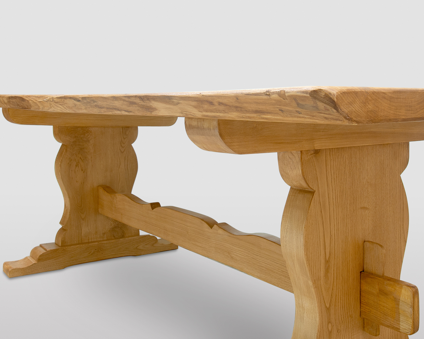 Fratino Dining Table in rustic syle realised entirely in Chestnut solid wood. Artisanal manufacturing with finishings realised by hand. Eight seats. The top is made up of an unique wooden board, obtained directly from the section of the log. Intentionally not refined, except from the removal of the cortex, for giving to the furniture a natural and rustic aspect. The openings, imperfections and knots are kept unchanged, Since it is obtained directly from the log, each table top is unique and will have shape, dimensions and edges different from the others. Painted with water based ecological varnishes, free of toxic emissions. Hand polished with beeswax.