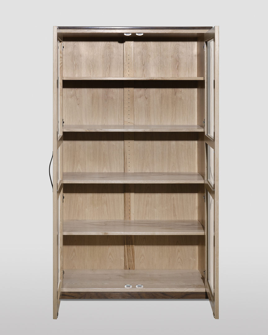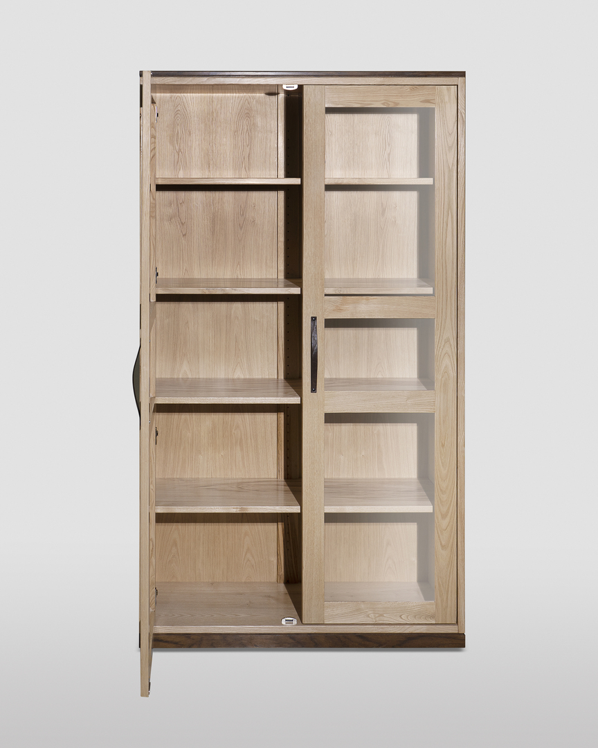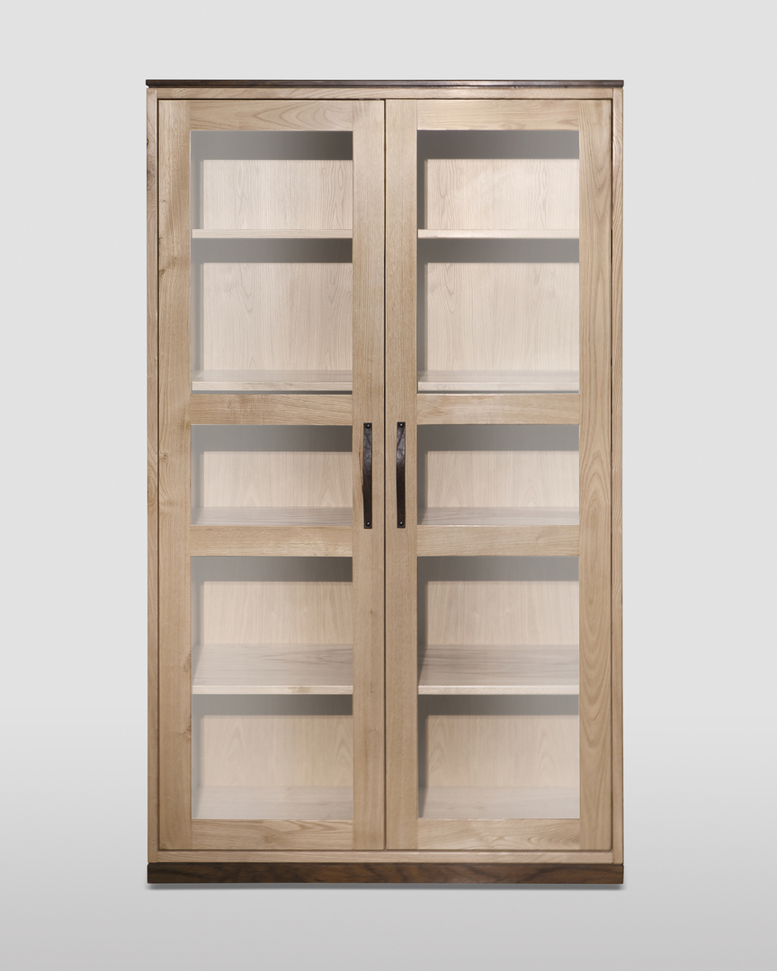 Handmade, minimalist-style bookcase crafted entirely from solid chestnut wood. This unique piece features attention to aesthetic details and premium accessories like elegant leather handles and modern, metal magnets of distinction. The library has two glass doors equipped with BLUM metal hinges with a slow-closing feature. The base and top frame are made from dark walnut wood, intentionally chosen to create a color contrast with the light chestnut wood. The library has four adjustable, solid wood shelves and leveling feet to eliminate any unevenness on the floor. The construction of the furniture is sustainably minded, minimizing the use of vinyl glue and preferring the use of joints. The painting is done with eco-friendly, water-based paints with no toxic emissions, while the final polishing is done by hand with beeswax to give the library an additional element of distinction with a seductive matte satin effect and a soft touch. The library is disassemblable and we used Lamello's invisible Clamex joints. It comes with instructions for easy and quick assembly that can be done independently. Upon request, we can customize this piece, making it to measure and potentially in other woods, colors, and finishes. Contact us for a personalized quote.