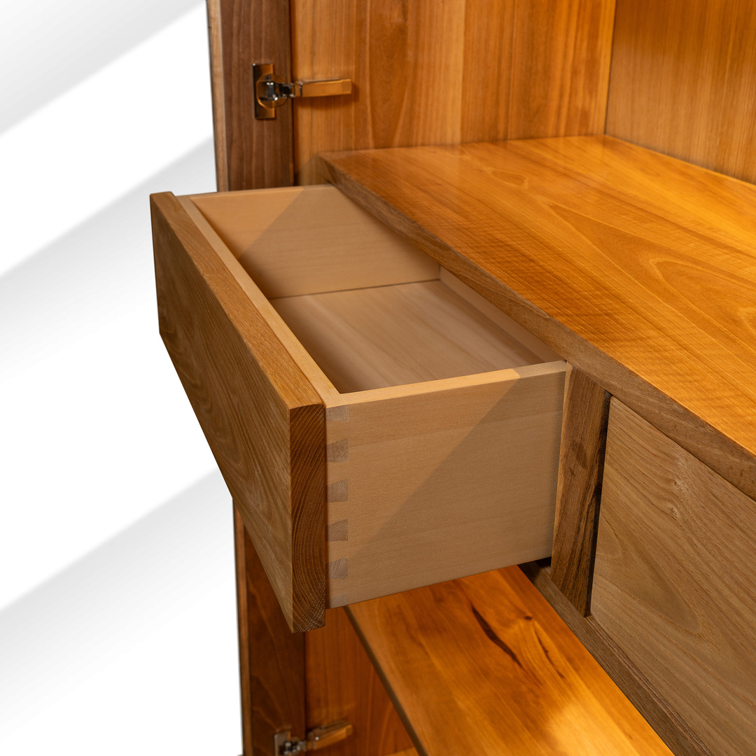Inside, the two drawers run on concealed Blum push-to-open slides and are built with double dovetail joints, a hallmark of high-end joinery that guarantees strength and longevity.