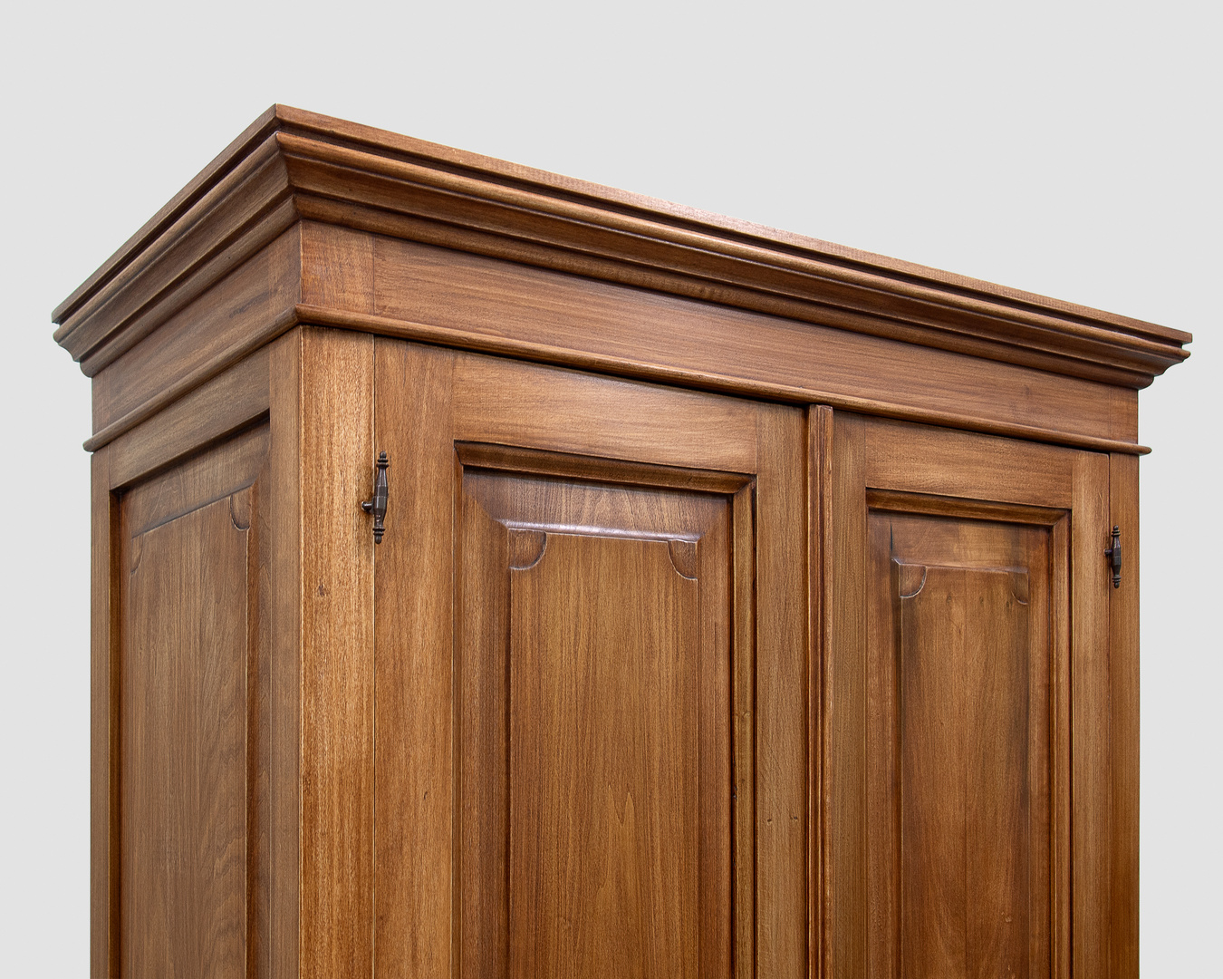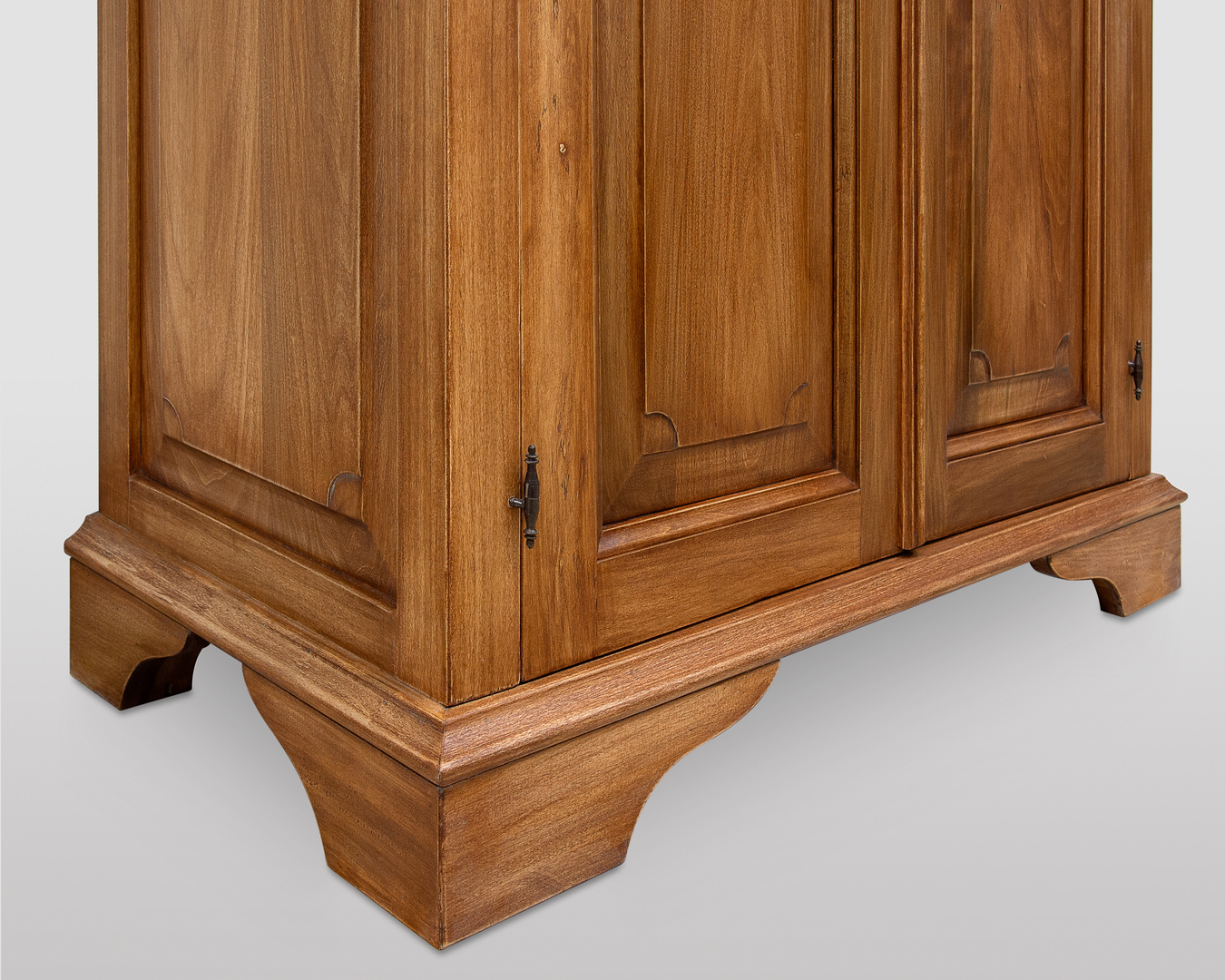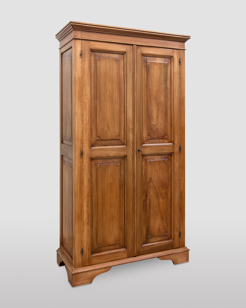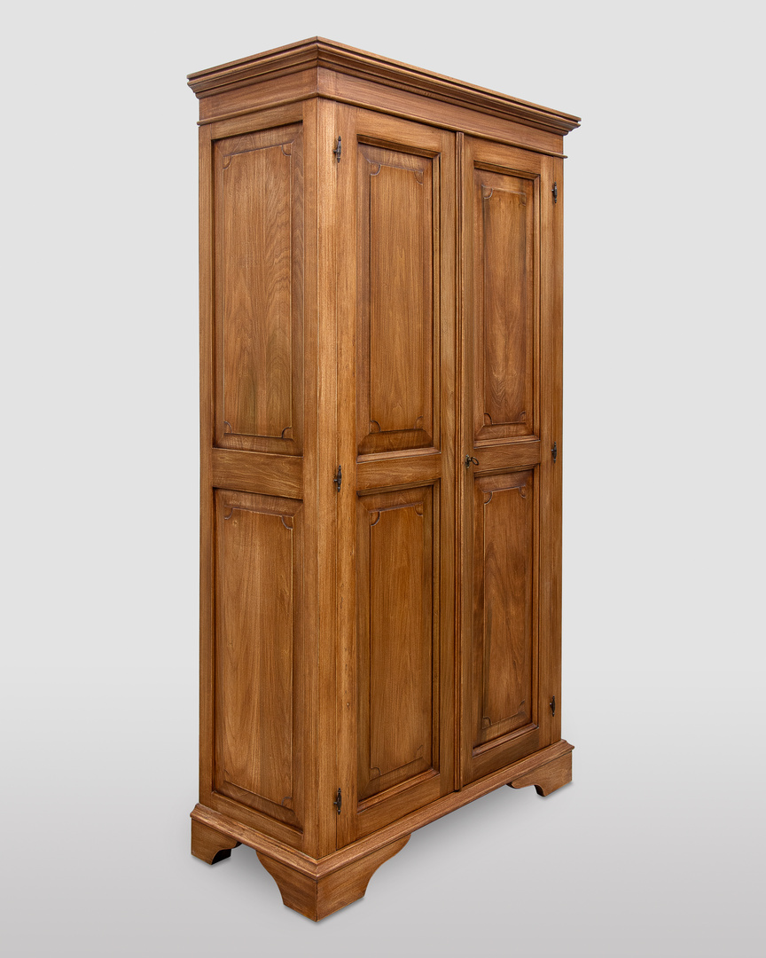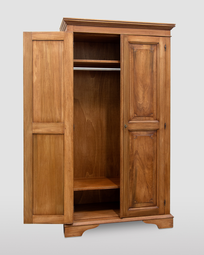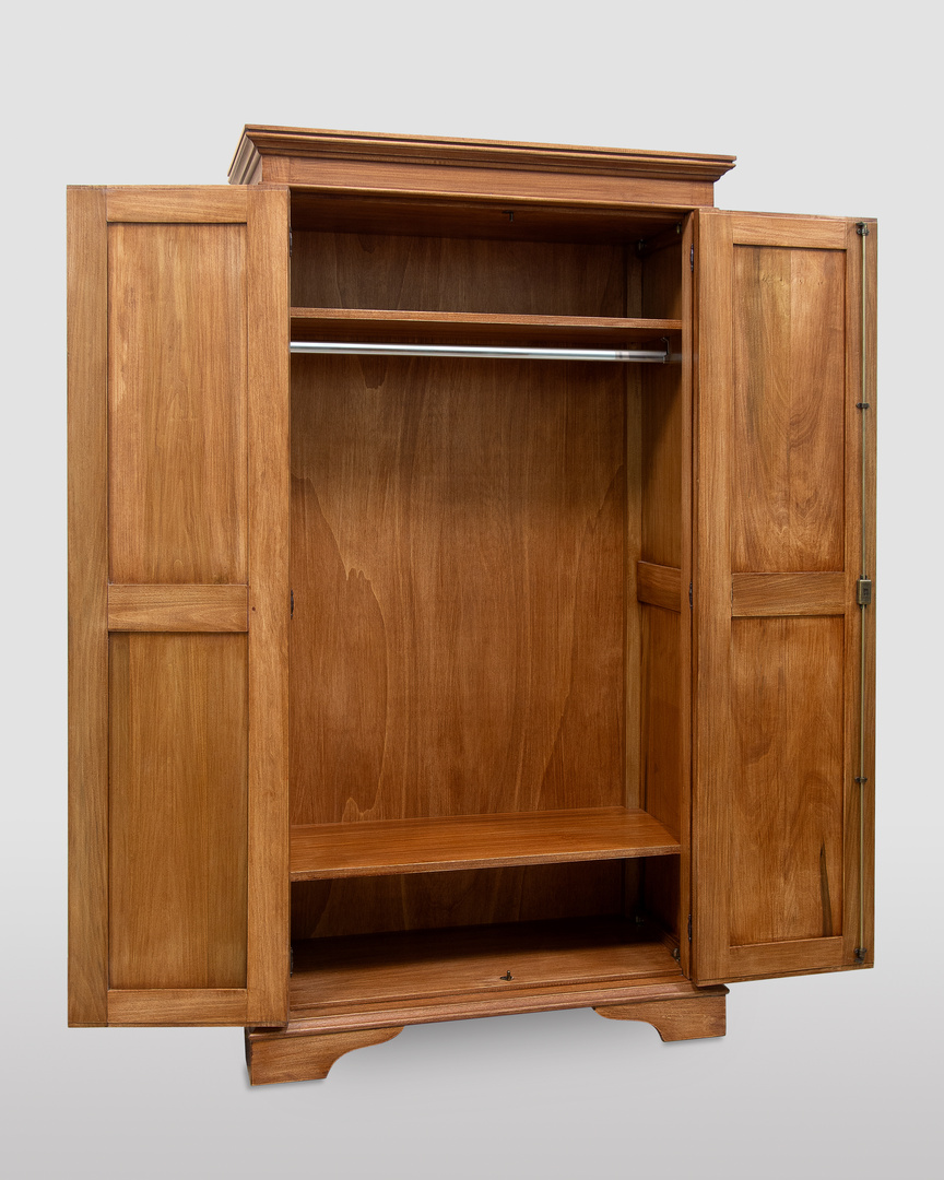 Armadio due ante realizzato in legno massello di toulipier. Produzione di tipo artigianale con rifiniture interamente eseguite a mano. Stile rustico. Ante e fianchi con pannelli bugnati ed incisioni decorative. Serratura con chiusura a doppio gancio che ancora stabilmente le ante alla struttura del mobile evitandone eventuali curvature nel tempo, garantendo una chiusura sempre perfetta. Interno con bastone appendiabiti e due ripiani in legno. Spigoli smussati.