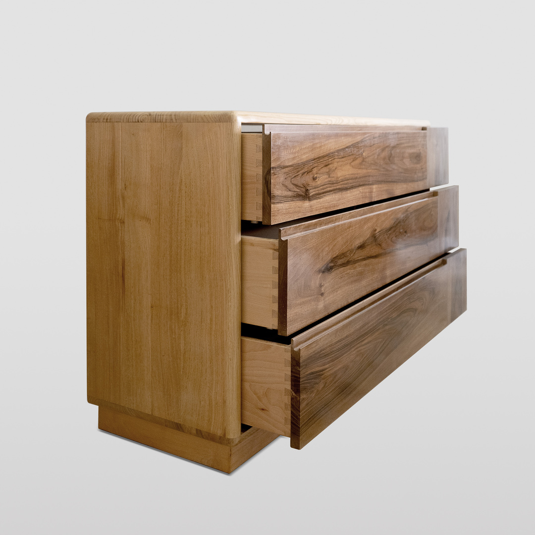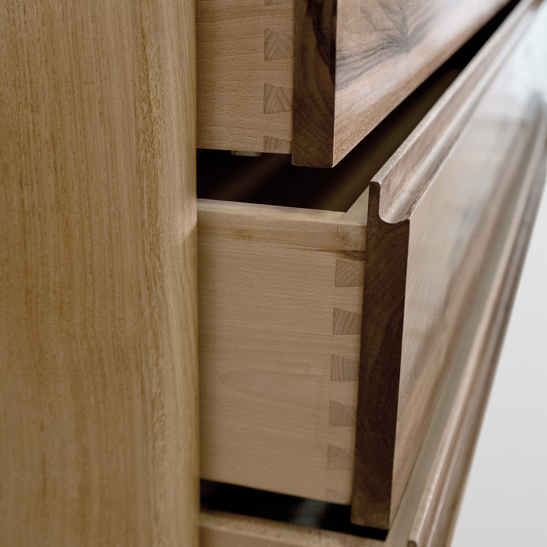 La struttura è realizzata in resistente castagno massello, mentre il frontale dei cassetti è in noce massello, caratterizzato da venature naturali uniche che conferiscono calore e personalità al mobile. Un dettaglio di grande valore è la struttura interna dei cassetti, costruita in faggio massello con un doppio incastro a coda di rondine sia nella parte anteriore che in quella posteriore. Questa tecnica, emblema di maestria artigianale, assicura massima stabilità e durata nel tempo, riflettendo un’attenzione ai dettagli che distingue i mobili di alta qualità.