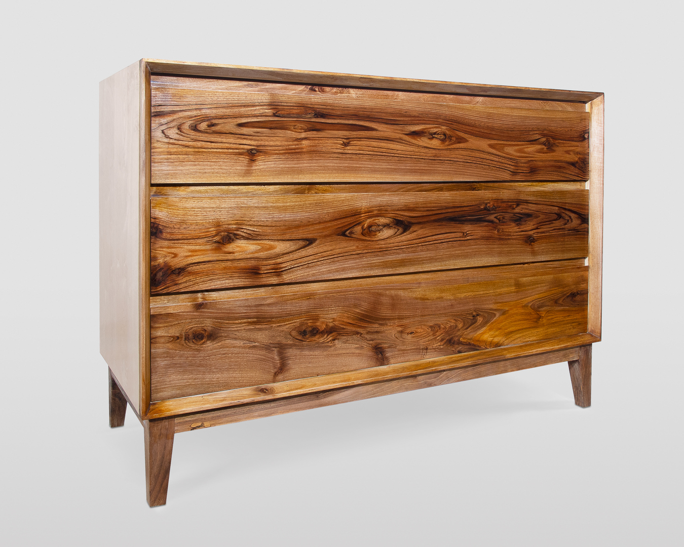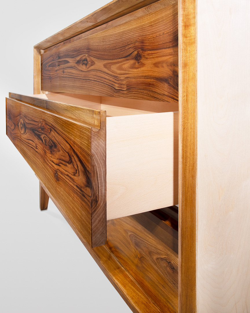 Cassetti costruiti con incastri a coda di rondine, ideati senza maniglie per lasciare intatta la bellezza di questa pregiata e rara essenza. L'apertura è consentita tramite gole finemente lavorate presenti nella parte superiore dei frontali.