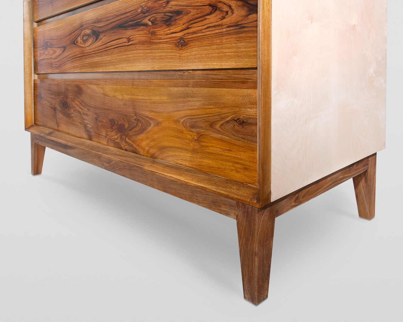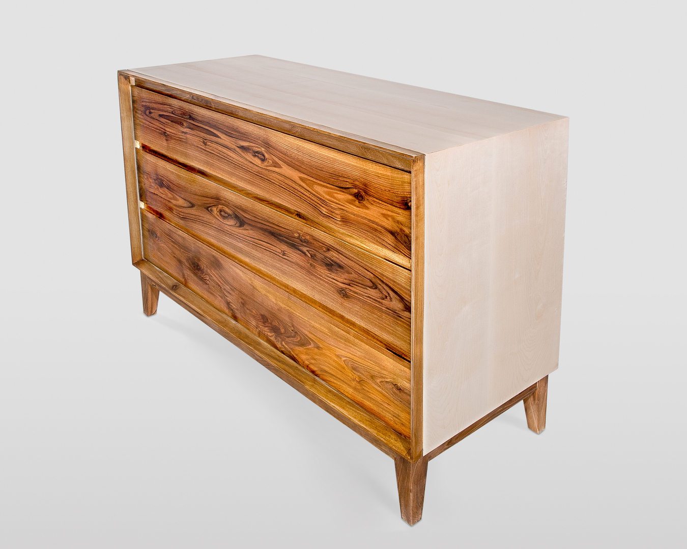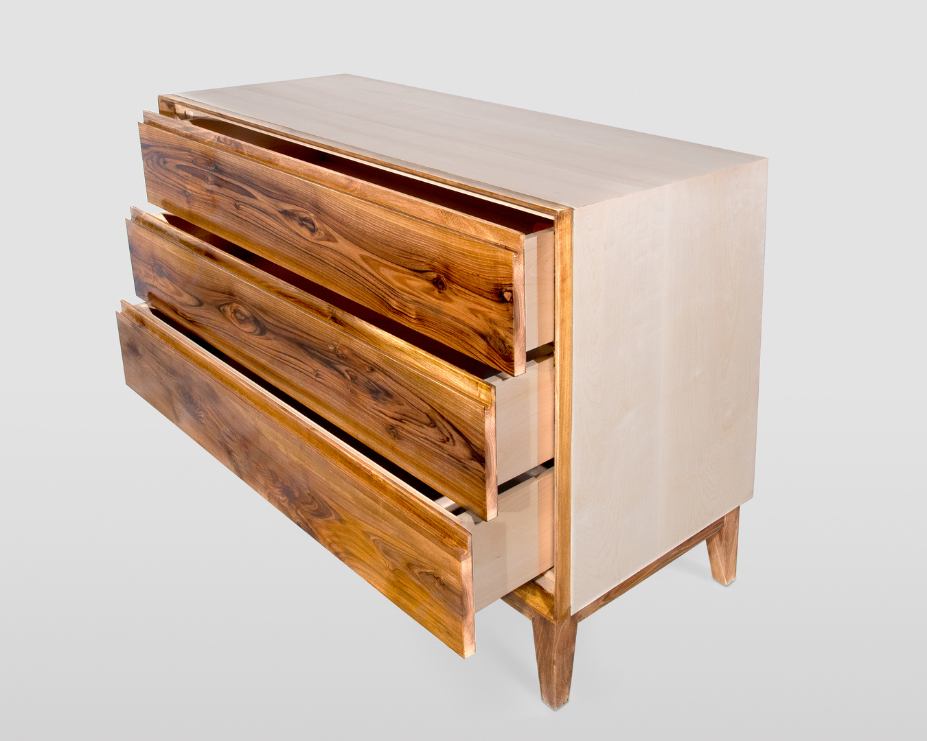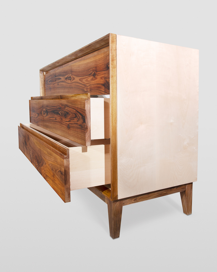 Cassettiera tre cassetti, realizzata in legno massello, combinando tra loro due pregiatissime essenze, il noce e l'acero. Realizzazione artigianale, con lavorazioni e rifiniture interamente eseguite a mano.