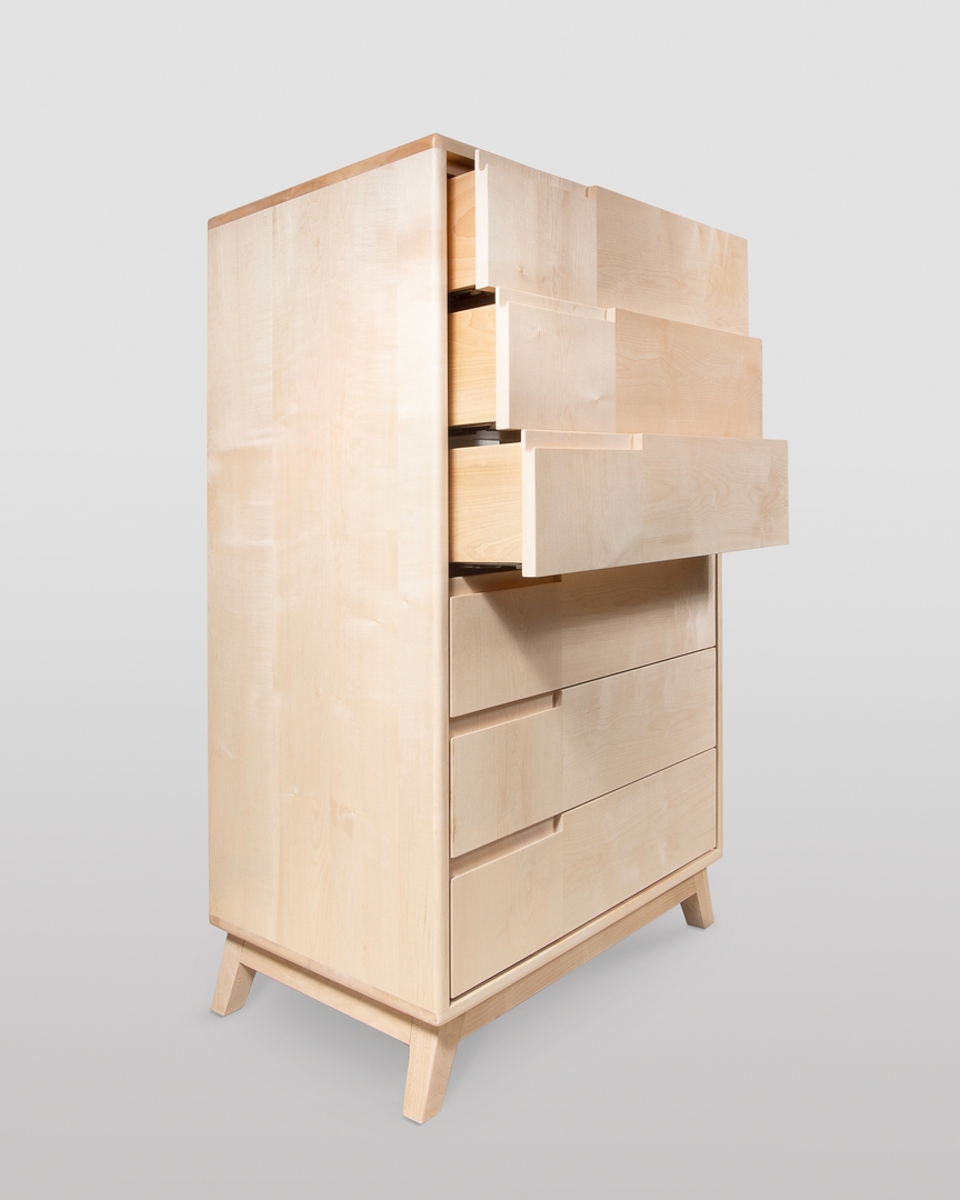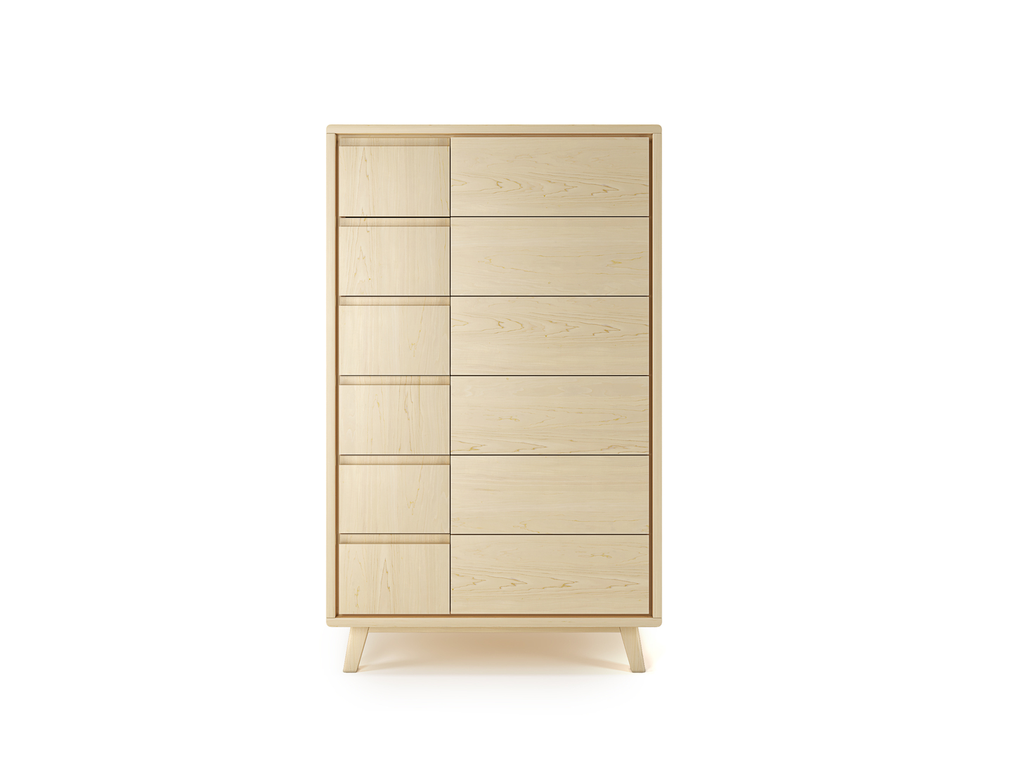 Cassettiera in stile scandinavo realizzata interamente in Acero massello. Produzione di tipo artigianale con rifiniture interamente eseguite a mano. Design lineare, struttura semplice e lineare, con fianchi lisci e bordi arrotondati. Base a telaio con gambette leggermente inclinate.