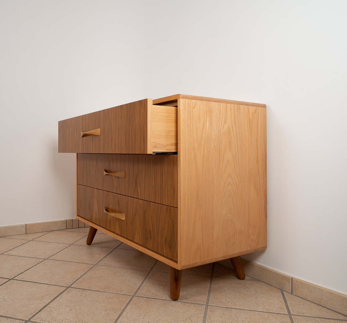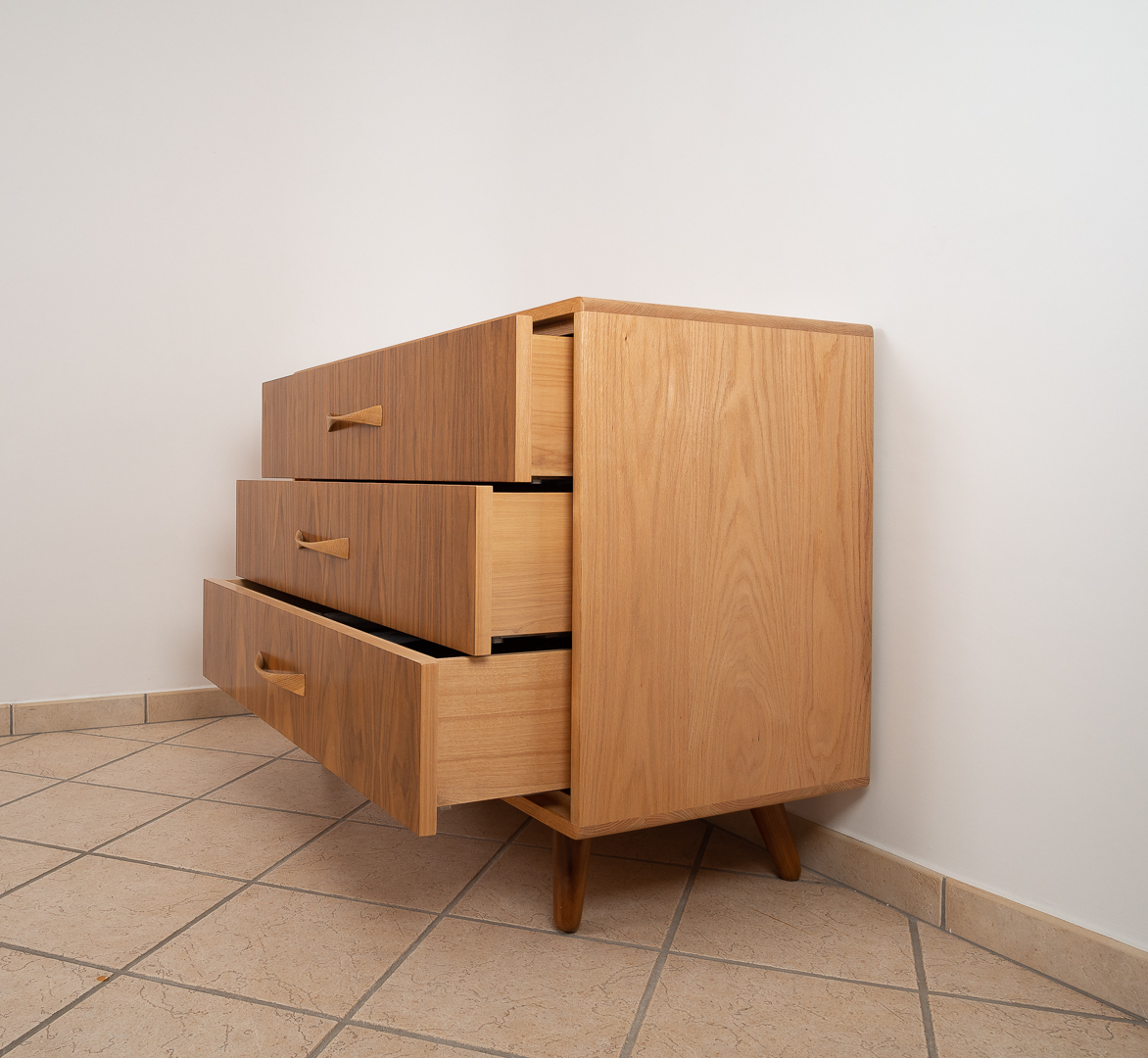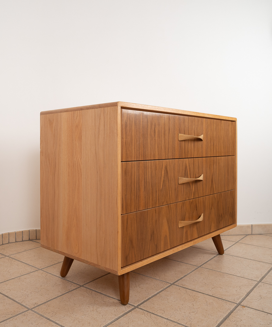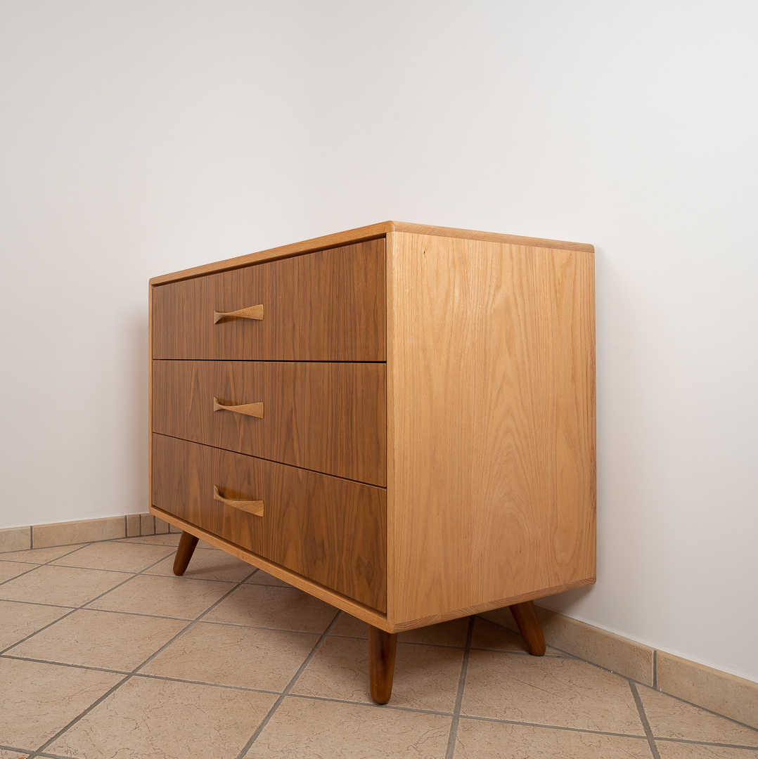 Comò in stile scandinavo realizzato in legno massello di rovere, caratterizzato da un design lineare, linee pulite e sobrie, con struttura di tipo squadrato e bordi arrotondati. Produzione artigianale di alta ebanisteria, con rifiniture scrupolosamente eseguite a mano. Tre cassetti con frontali in noce Canaletto e guide metalliche, nascoste marca Blum, a estrazione totale con elevata capacità di carico, caratterizzate dal loro esclusivo sistema di chiusura rallentata Blumotion. Struttura interna dei cassetti realizzata in faggio massello con incastri a coda di rondine.