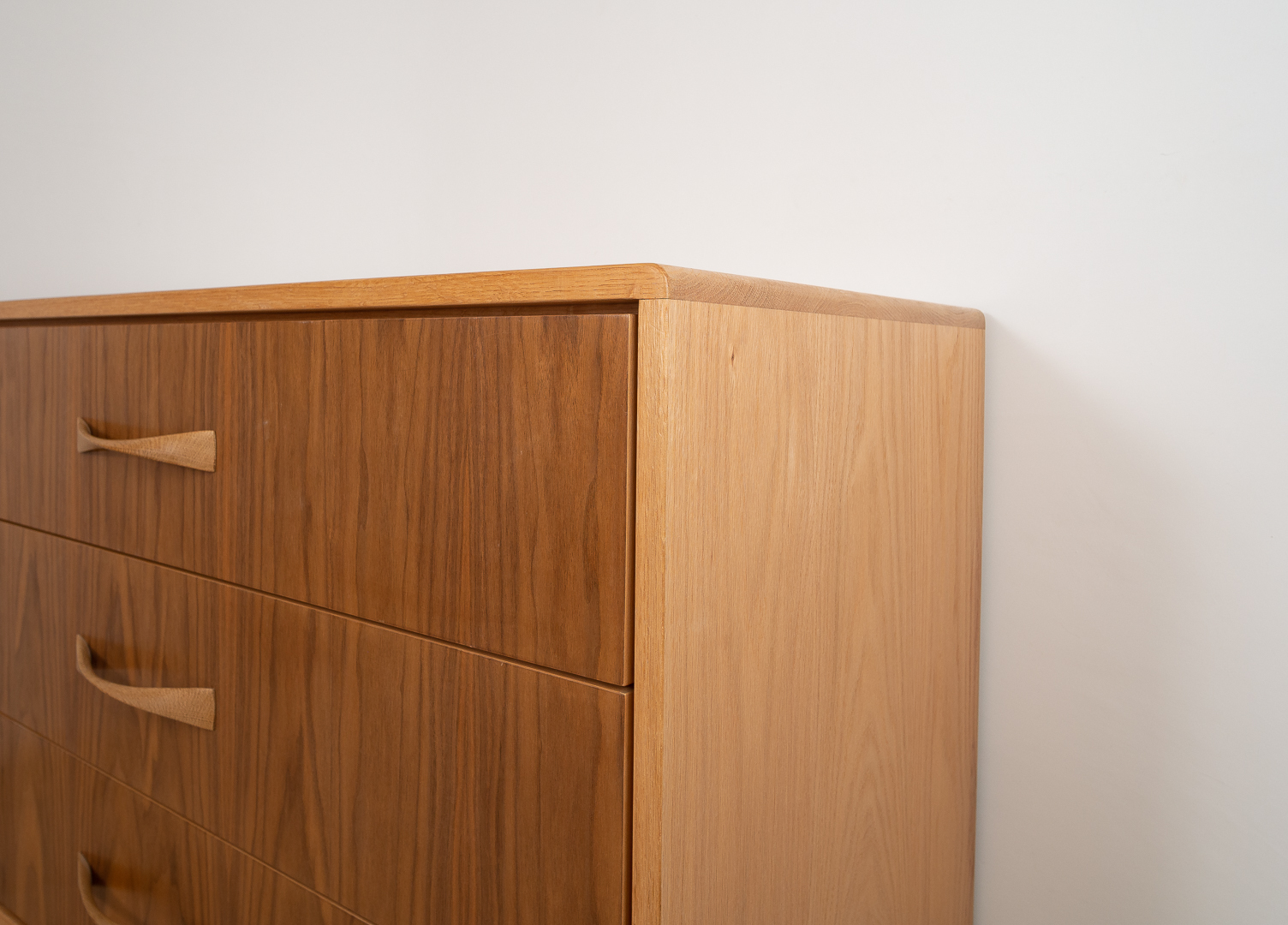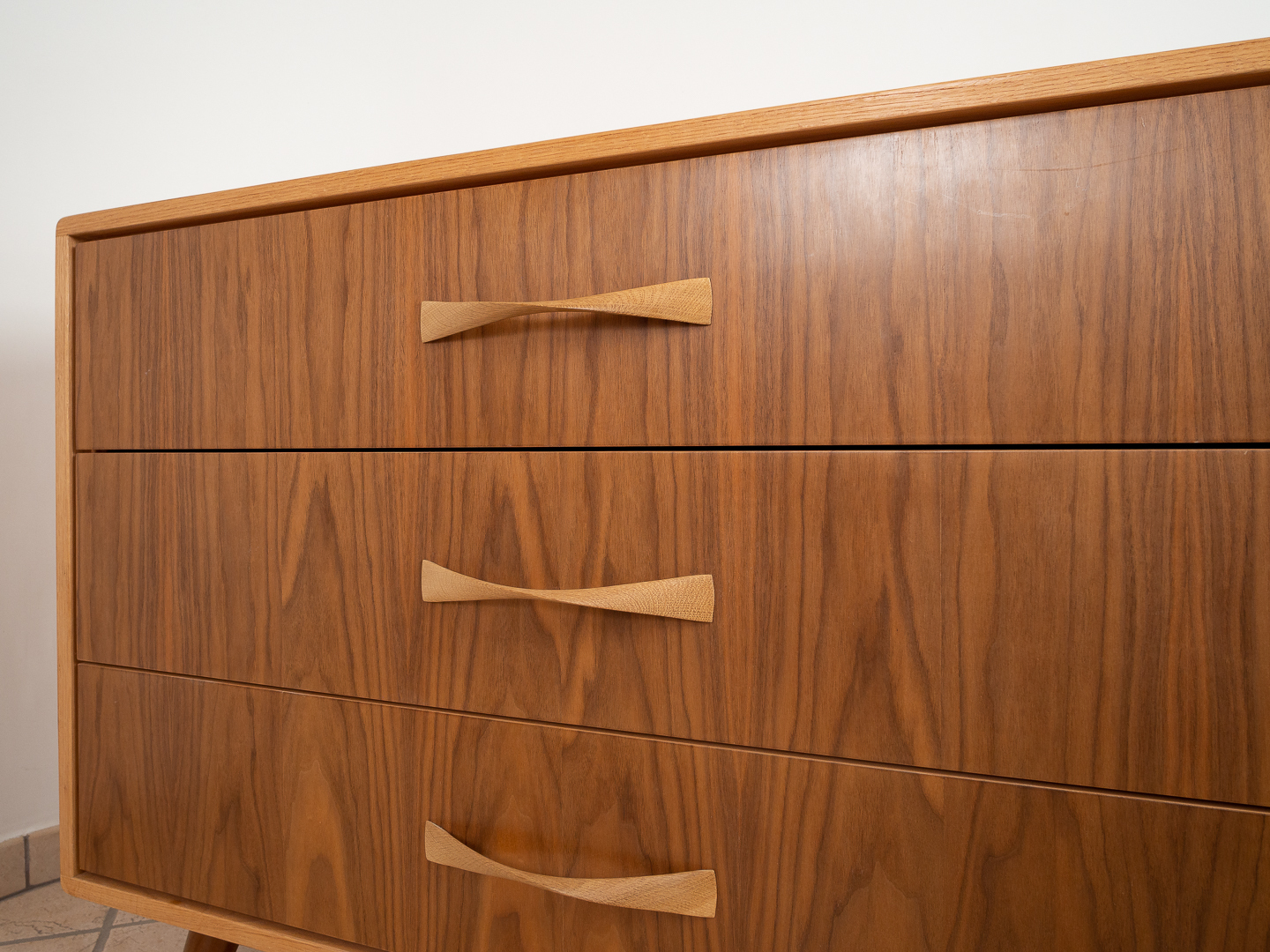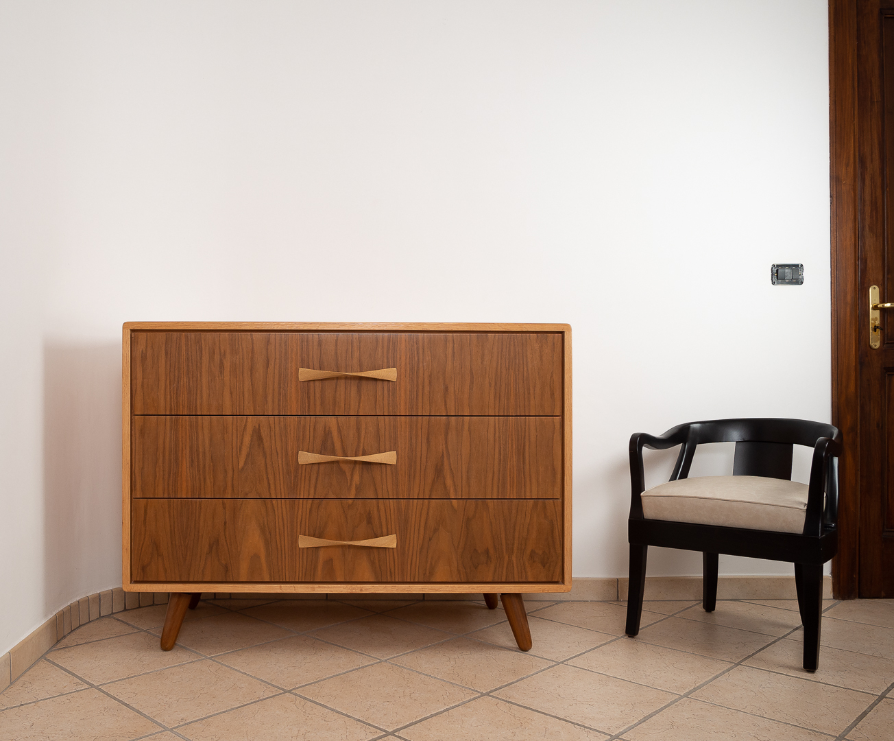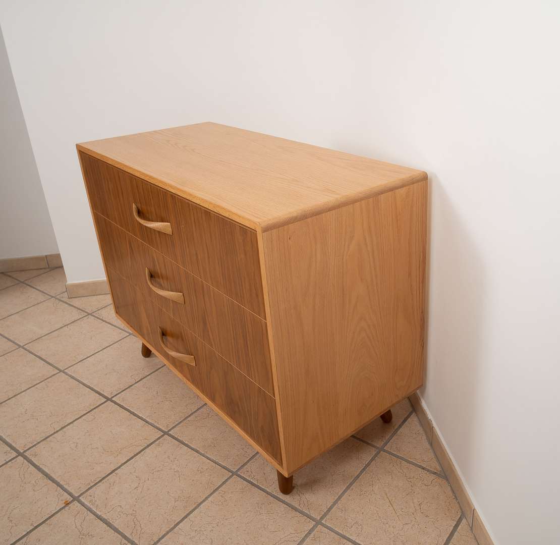 Comò in stile scandinavo realizzato in legno massello di rovere, caratterizzato da un design lineare, linee pulite e sobrie, con struttura di tipo squadrato e bordi arrotondati. Produzione artigianale di alta ebanisteria, con rifiniture scrupolosamente eseguite a mano. Tre cassetti con frontali in noce Canaletto e guide metalliche, nascoste marca Blum, a estrazione totale con elevata capacità di carico, caratterizzate dal loro esclusivo sistema di chiusura rallentata Blumotion. Struttura interna dei cassetti realizzata in faggio massello con incastri a coda di rondine.