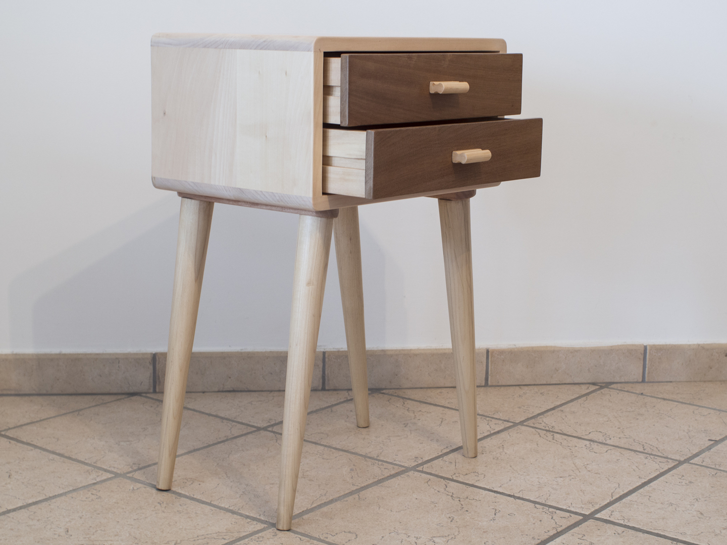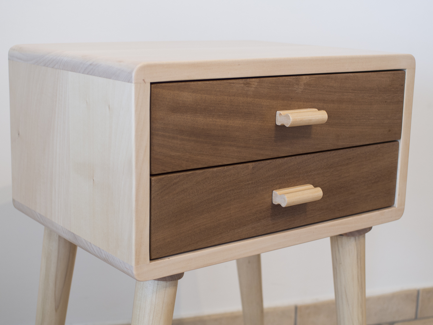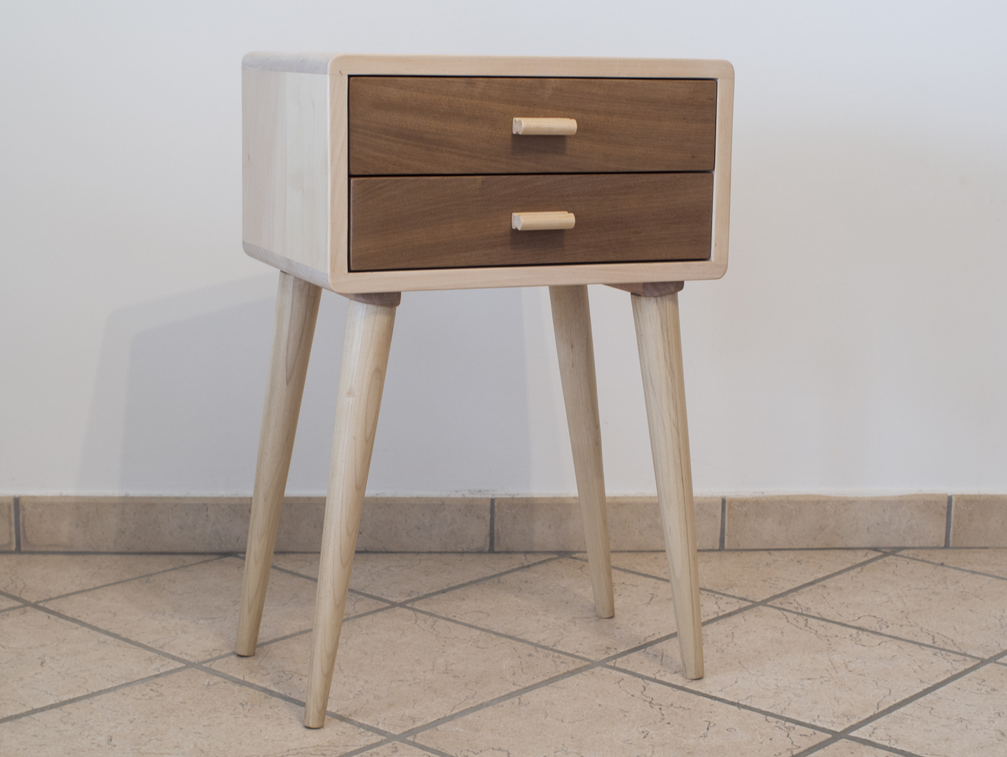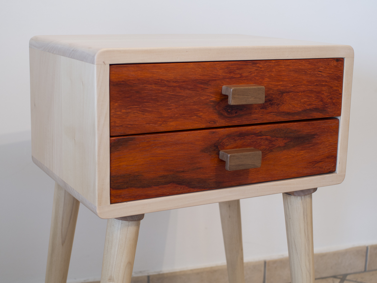 Comodino in stile anni 50, realizzato in legno massello di tiglio. Produzione di tipo artigianale con rifiniture interamente eseguite a mano. Due cassetti con frontali in legno di noce Bibolo o Padouk. Maniglie in legno. Gambe coniche ed affusolate in legno. Bordi arrotondati e spigoli smussati. Colore naturale. Verniciatura con vernici ecologiche a base d'acqua che non rilasciano emissioni tossiche nell'ambiente. Rifinitura finale eseguita a mano con cera d'api.