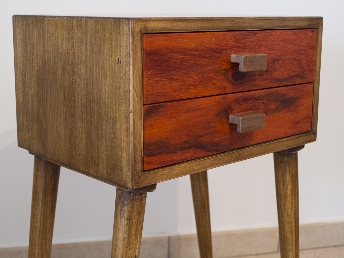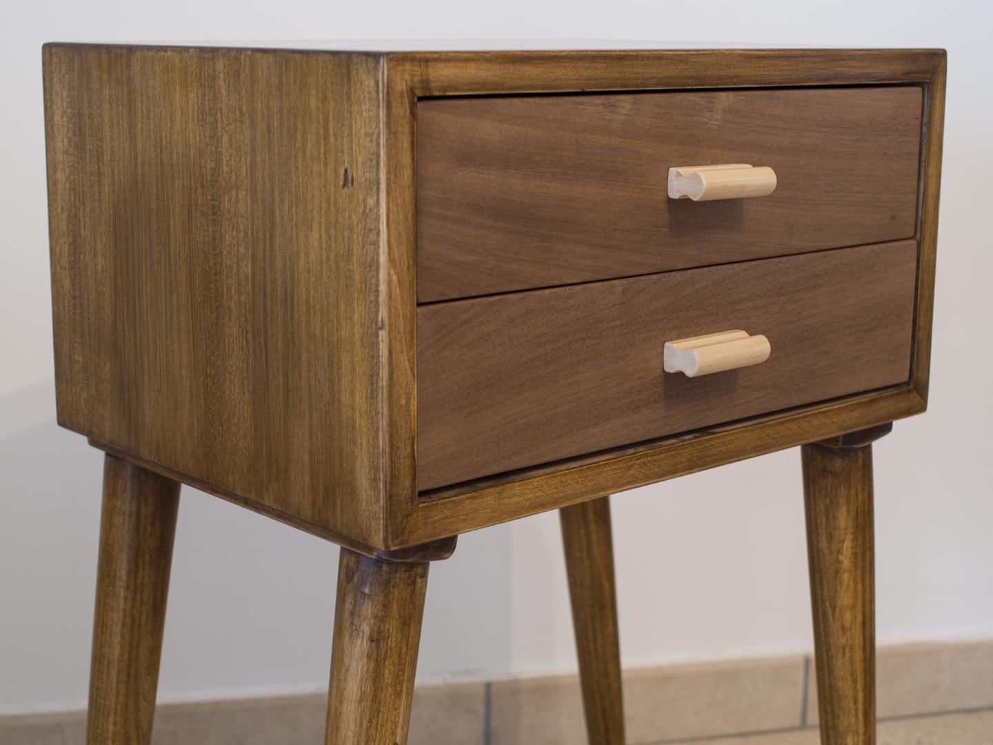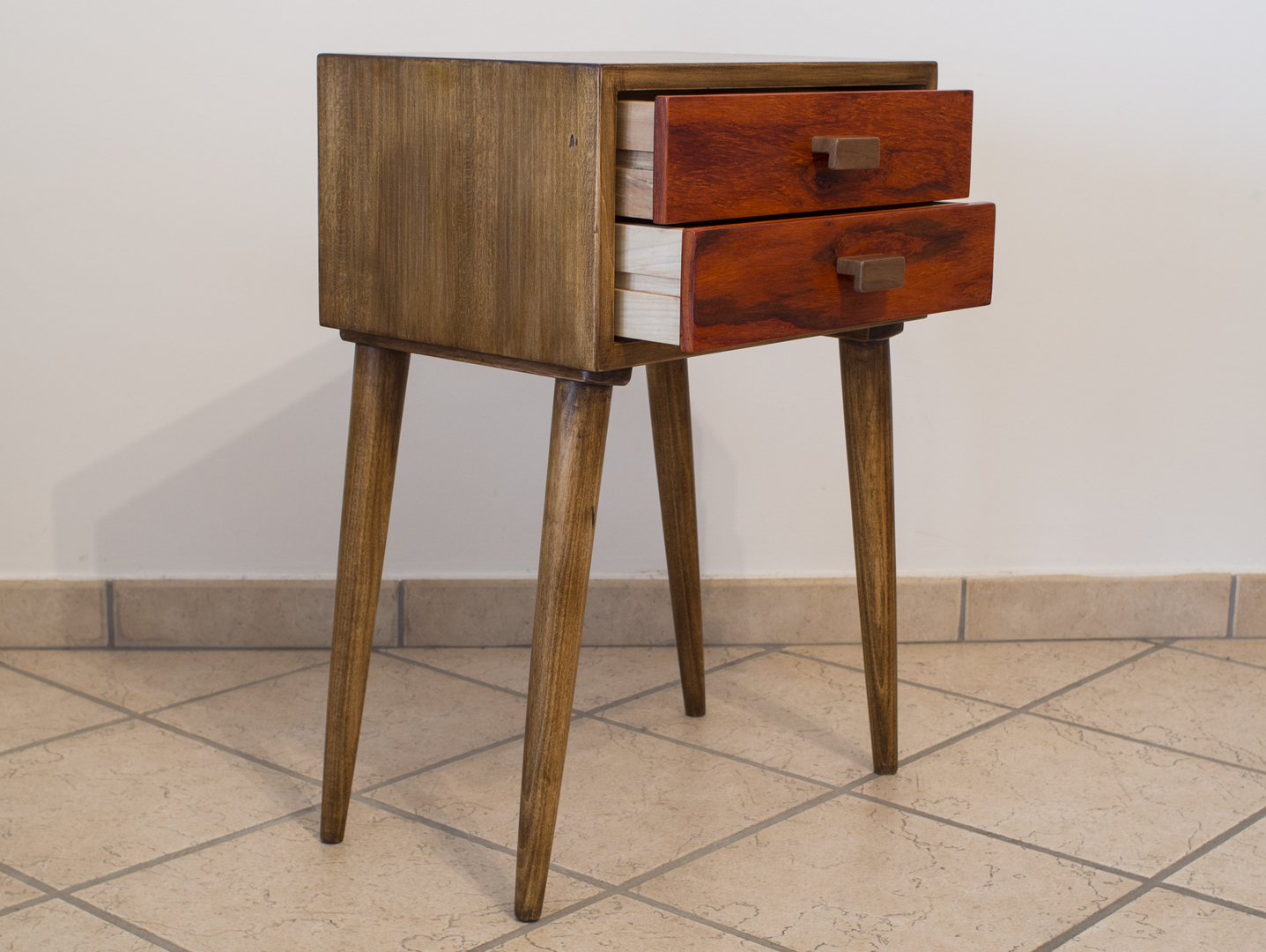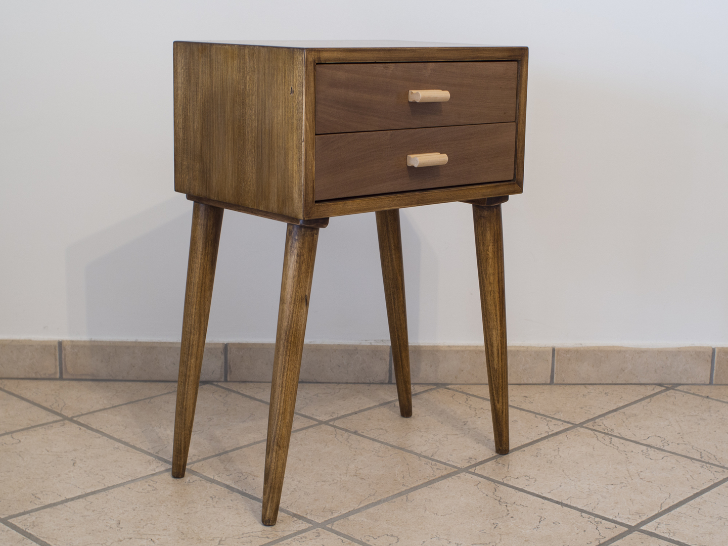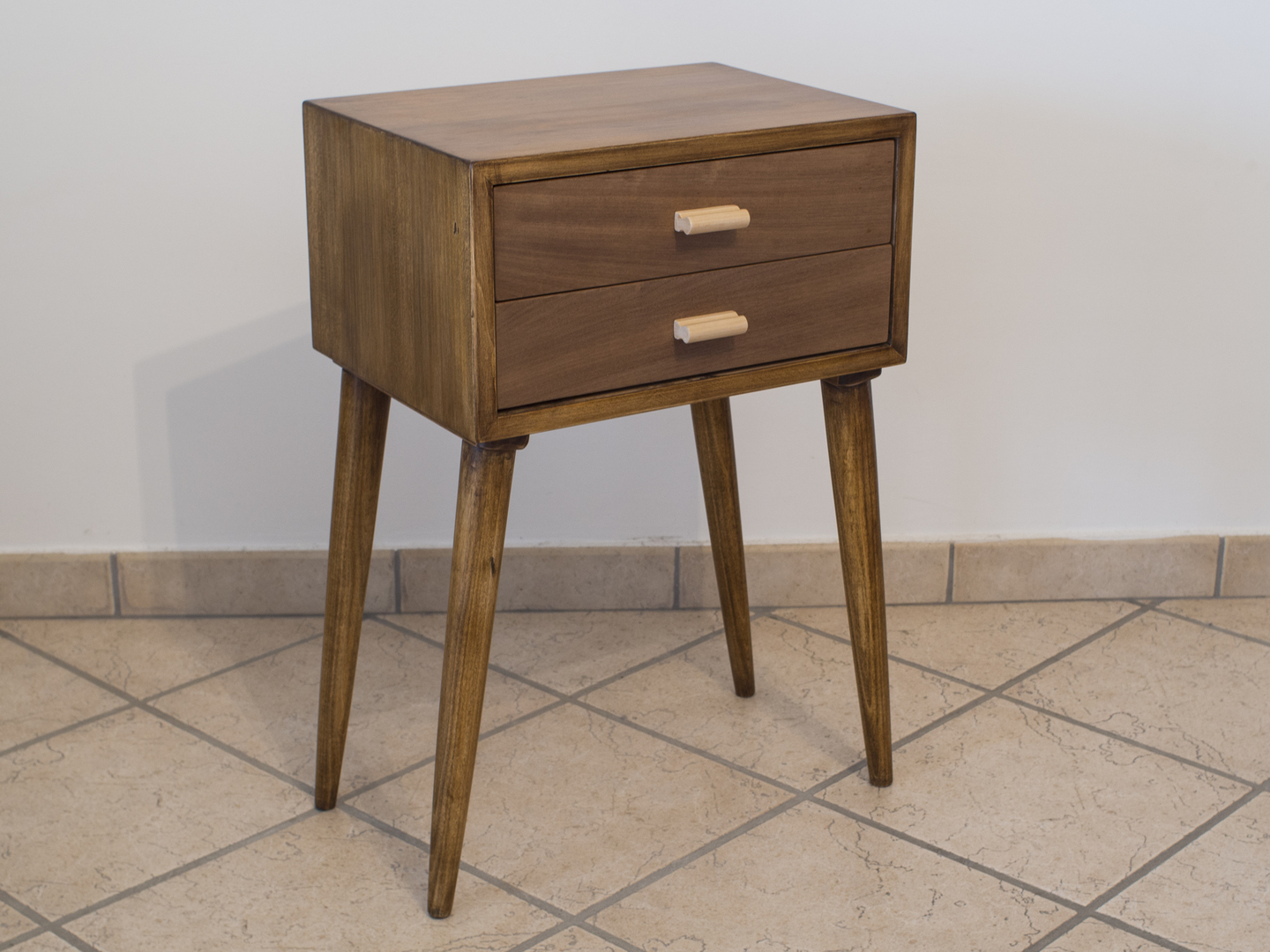 Comodino in stile anni 50, realizzato in legno massello di tiglio. Produzione di tipo artigianale con rifiniture interamente eseguite a mano. Due cassetti con frontali in legno di noce Bibolo o Padouk. Maniglie in legno. Gambe coniche ed affusolate in legno. Bordi arrotondati e spigoli smussati. Colore noce scuro. Verniciatura con vernici ecologiche a base d'acqua che non rilasciano emissioni tossiche nell'ambiente. Rifinitura finale eseguita a mano con cera d'api.