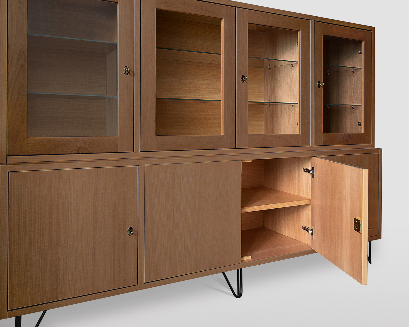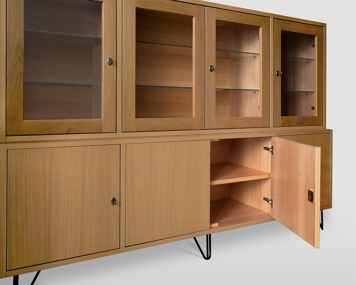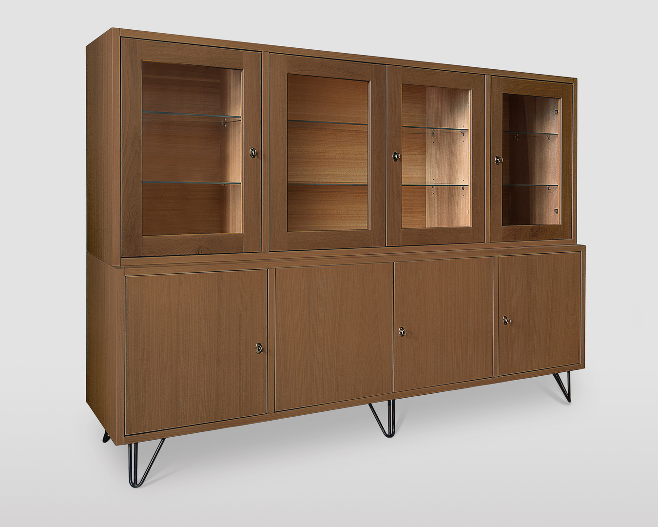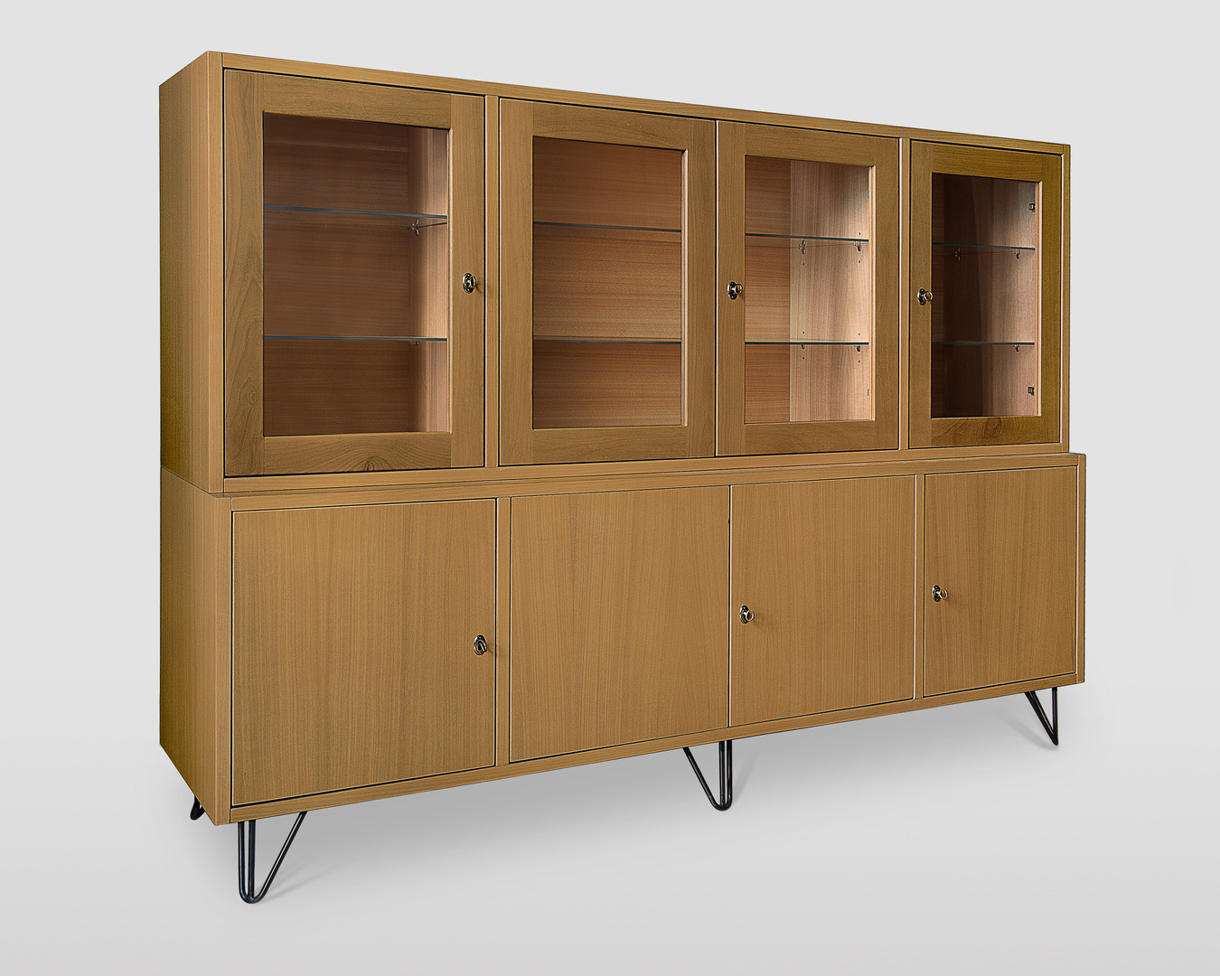 Produzione artigianale, completamente Made in Italy, realizzato esclusivamente in rovere massello. Registro superiore, con quattro ante a vetro e suddiviso in tre vani, ognuno dotato di due ripiani in vetro regolabili in altezza. Base con quattro ante chiuse, anch'esso suddiviso in tre vani, ognuno dotato di un ripiano in legno. Piedini in metallo, leggermente inclinati. Ante dotate di serratura e cerniere metalliche con chiusura rallentata. Finitura esterna in tonalità gialla, non coprente che lascia le venature a vista. Interni con finitura color rovere naturale.