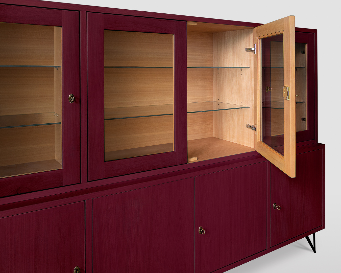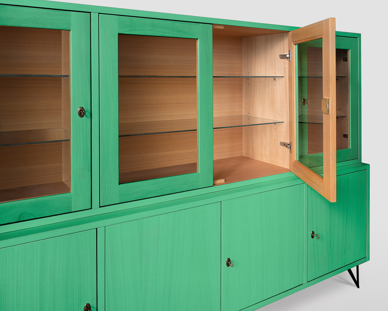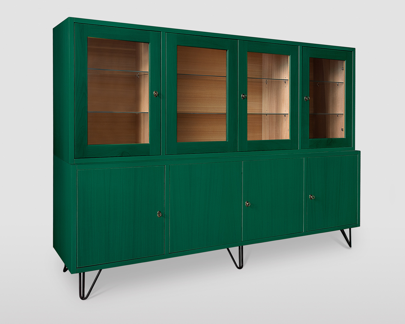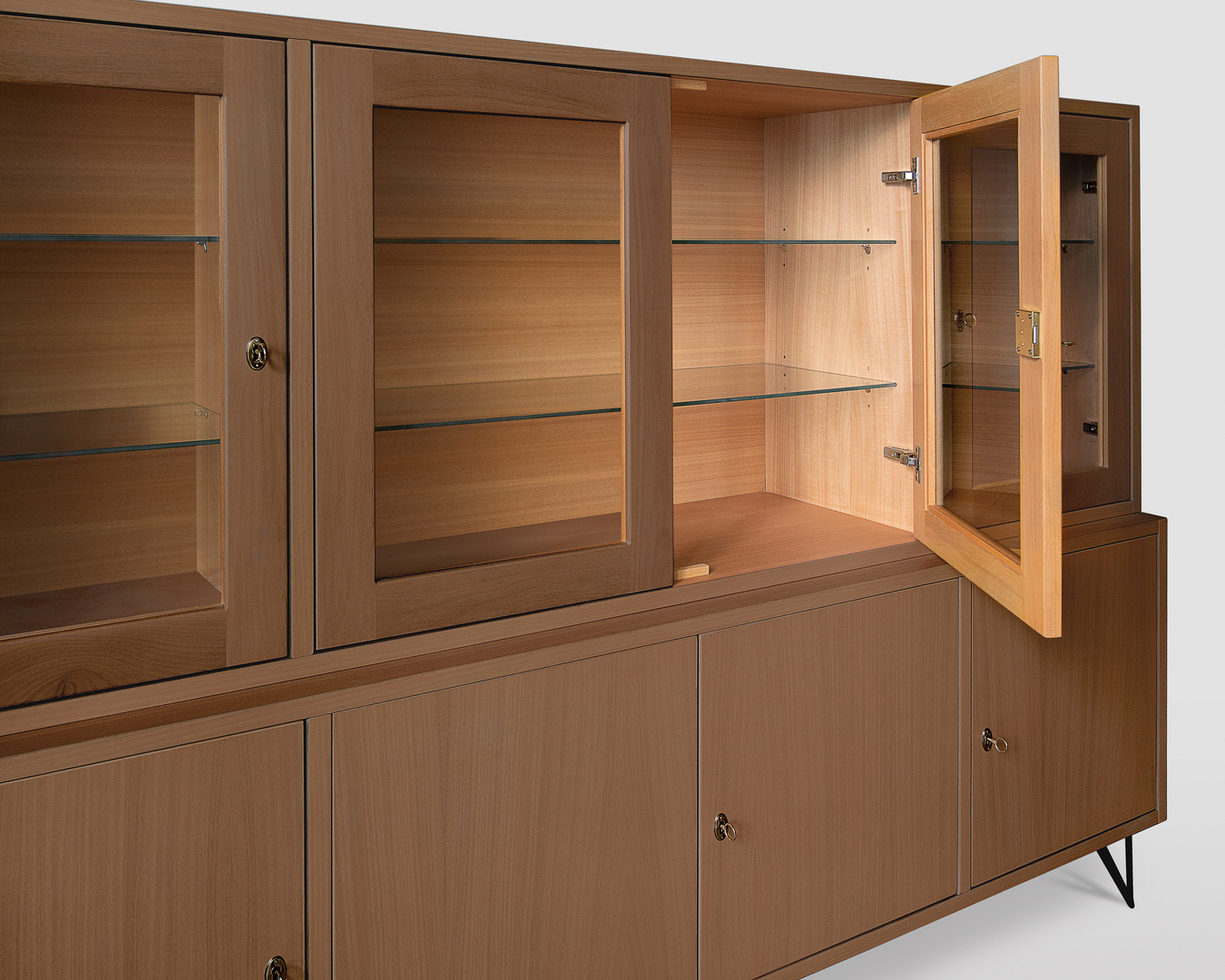 Produzione artigianale, completamente Made in Italy, realizzato esclusivamente in rovere massello. Registro superiore, con quattro ante a vetro e suddiviso in tre vani, ognuno dotato di due ripiani in vetro regolabili in altezza. Base con quattro ante chiuse, anch'esso suddiviso in tre vani, ognuno dotato di un ripiano in legno. Piedini in metallo, leggermente inclinati. Ante dotate di serratura e cerniere metalliche con chiusura rallentata. Finitura esterna in tonalità gialla, non coprente che lascia le venature a vista. Interni con finitura color rovere naturale.