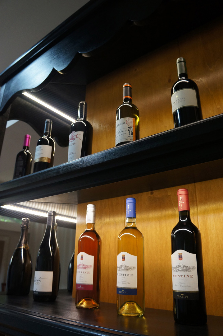 Mobile espositore per vini, realizzato in massello di Okumè. Produzione di tipo artigianale con rifiniture interamente eseguite a mano. Sezione ad U, concepito per rivestire il pilastro della sala. Struttura portante con colonne quadrate. Pannelli per rivestimento pilastro in legno listellare di noce. Tre ripiani in legno avvolgono i lati della colonna centrale. Top sagomato e base squadrata con zoccolatura. Eleganti cornici di rifinitura applicate lungo il perimetro esterno dei ripiani, conferiscono un notevole valore estetico al mobile. Luci led inclinate a 45 gradi, con lo scopo di dare risalto alle etichette dei vini riposte sui ripiani.