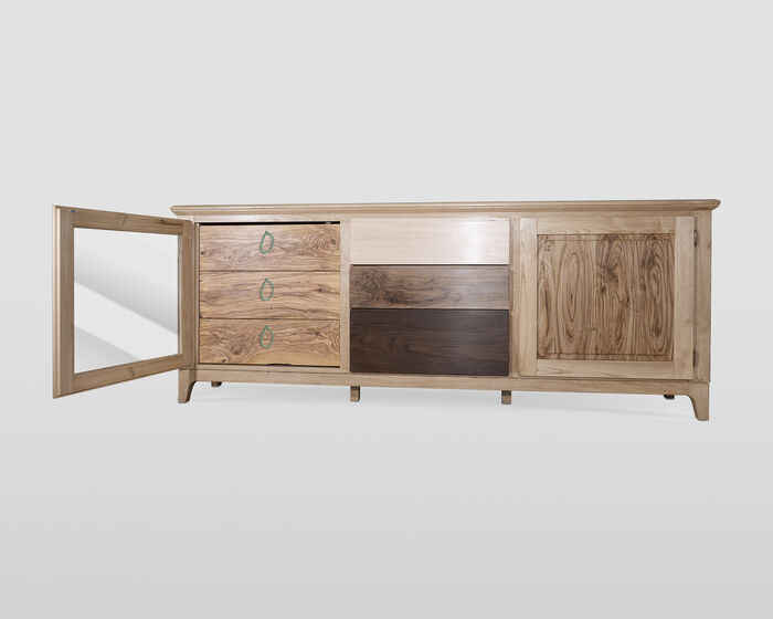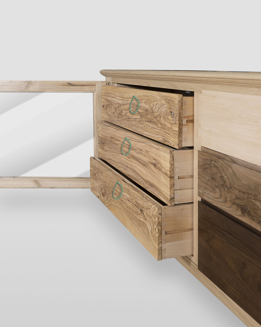 La madia presenta due ante e tre cassetti centrali, ognuno con dimensioni diverse, per offrire un ampio spazio per riporre i vostri oggetti. A sinistra, un'anta a vetro lascia intravedere i tre cassetti in ulivo, arricchiti da eleganti cordoncini in colore verde tiffany che ne consentono l'apertura. A destra abbiamo un pannello chiuso in castagno. Tutti i cassetti hanno la struttura interna in faggio massello, costruiti con doppio incastro a coda di rondine, sia nella parte anteriore che posteriore, e sono dotati di guide di scorrimento in legno. Inoltre, presentano una scanalatura funzionale come maniglia.