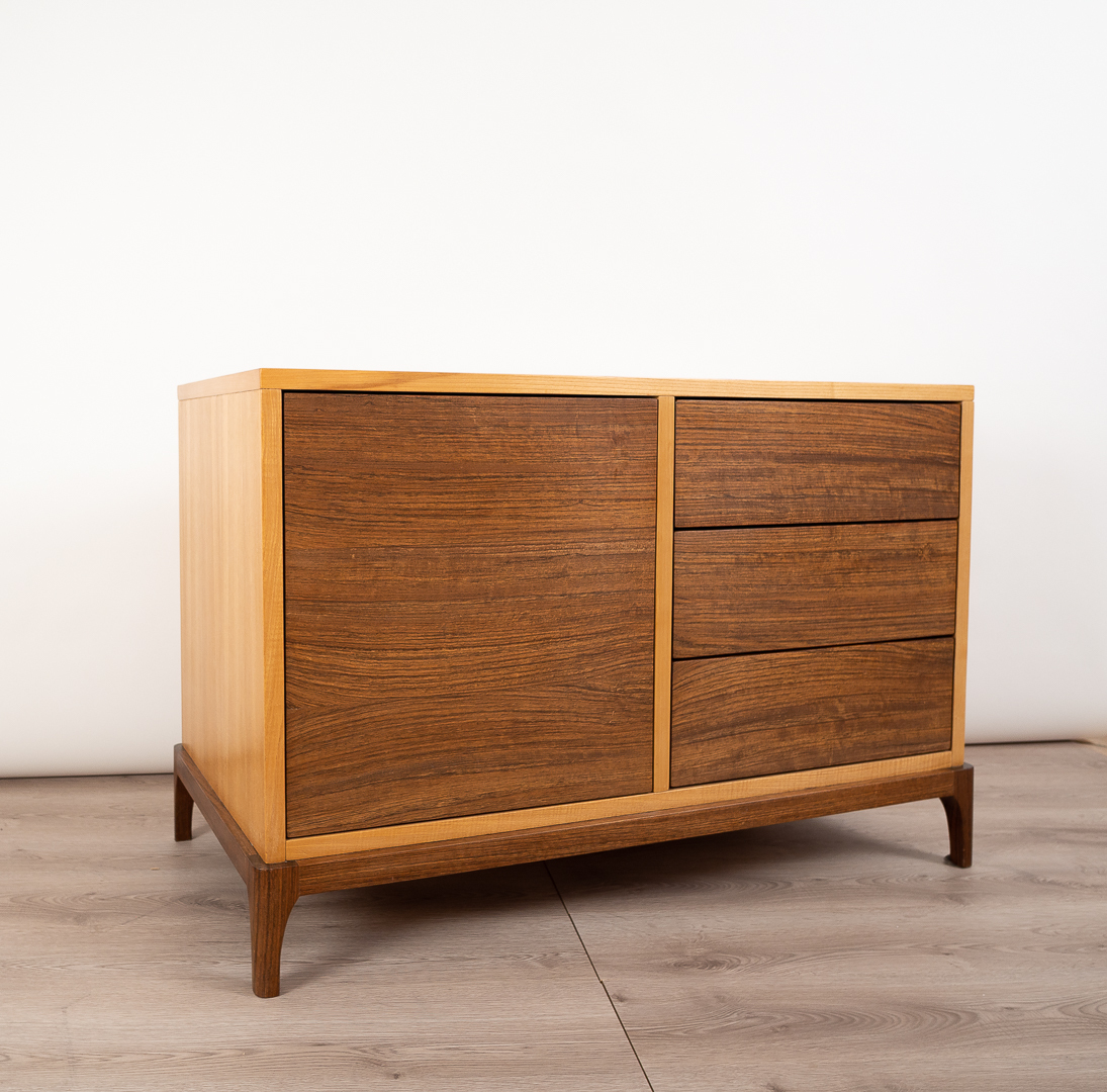 Madia in stile scandinavo realizzata dalla combinazione di pregiate essenze in legno massello: rovere, noce Daniela e frassino. Design semplice e lineare, caratterizzato da linee e forme pulite. Produzione di tipo artigianale di alta ebanisteria, con rifiniture interamente eseguite a mano e meticolosa attenzione a tutti i dettagli. Struttura squadrata in rovere massello, divisa in due sezioni. Lo scomparto a sinistra con anta liscia, in noce Daniela e vano interno dotato di un ripiano in legno; priva di maniglia, caratterizzata da apertura a pressione con sistema TIP-ON. Dotata di cerniere metalliche con chiusura rallentata. Sezione destra con tre cassetti a frontali lisci, in noce Daniela e struttura interna in frassino massello, costruita con incastri a coda di rondine. Apertura cassetti con sistema a pressione TIP-ON, con guide metalliche nascoste, marca Blum, caratterizzate da estrazione totale ed elevata capacità di carico.