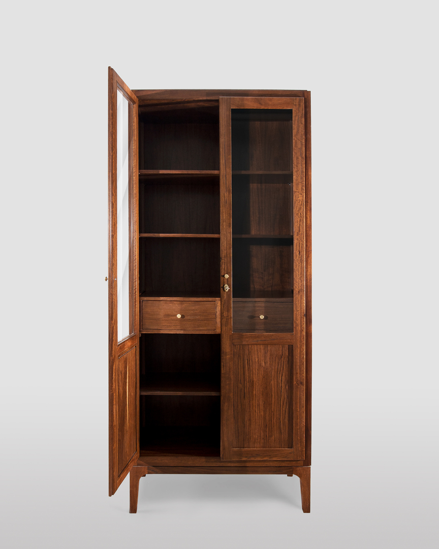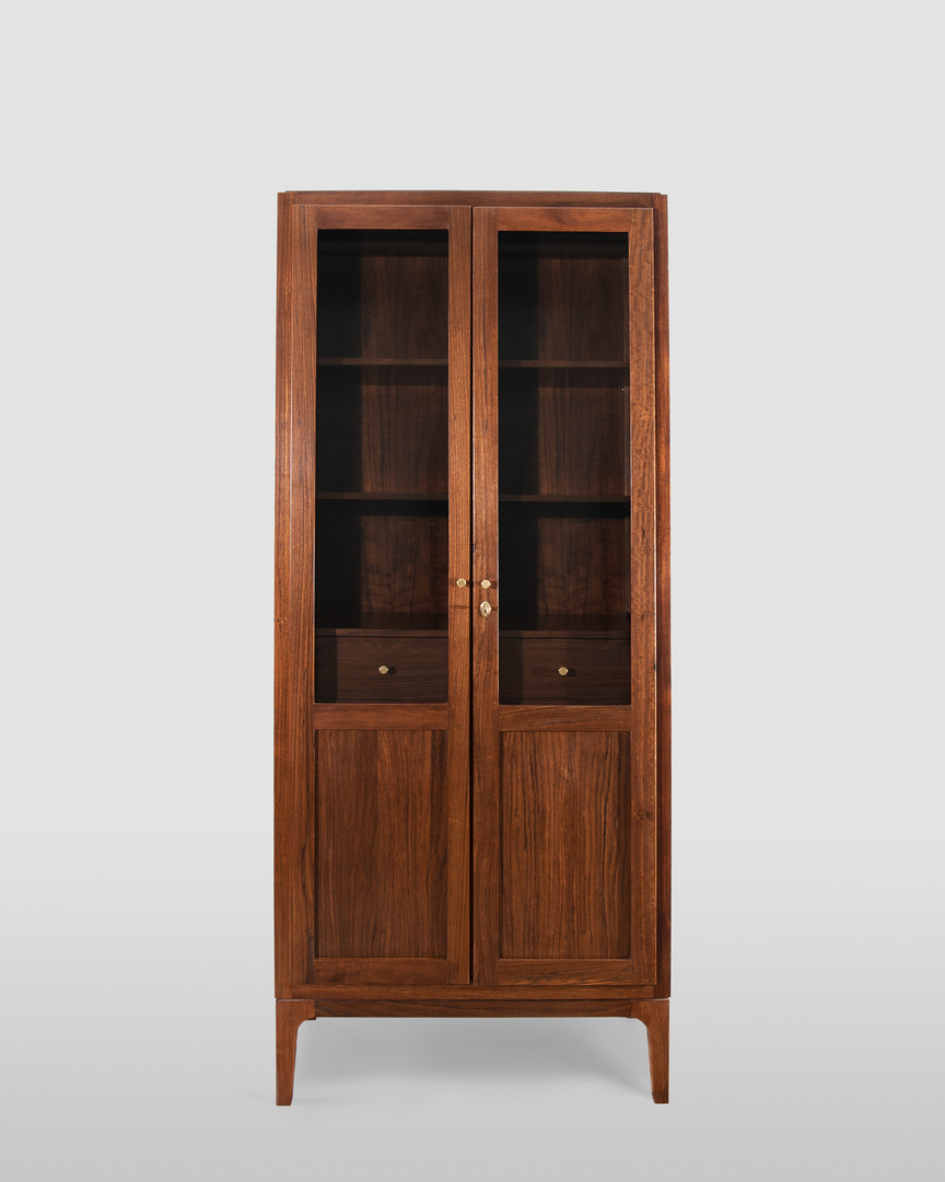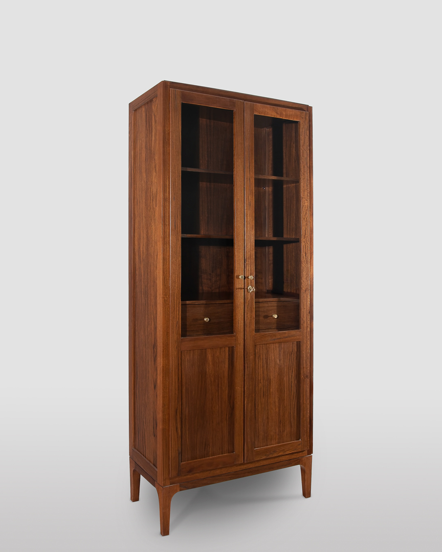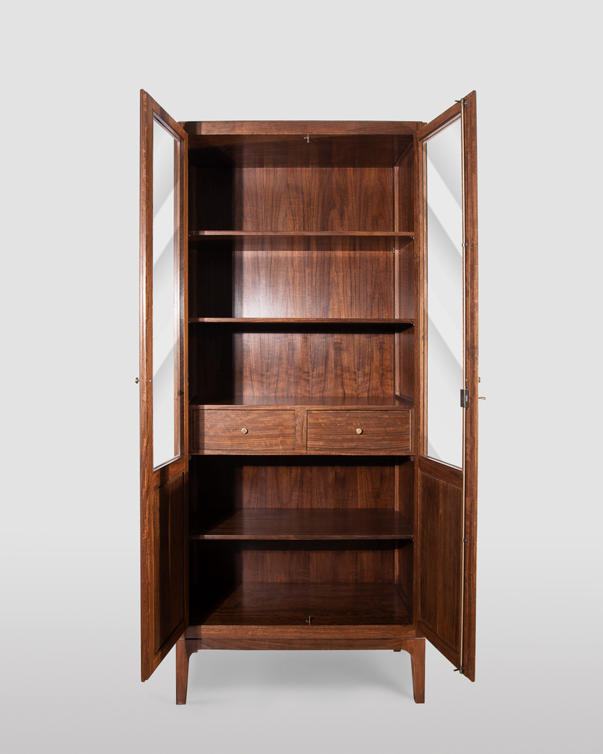 Vetrina moderna a due ante realizzata in noce Daniela, esclusivamente in legno massello. Design minimal, caratterizzata da forme pulite e sobrie. Produzione artigianale di alta ebanisteria, con rifiniture eseguite a mano e meticolosa cura per i dettagli.