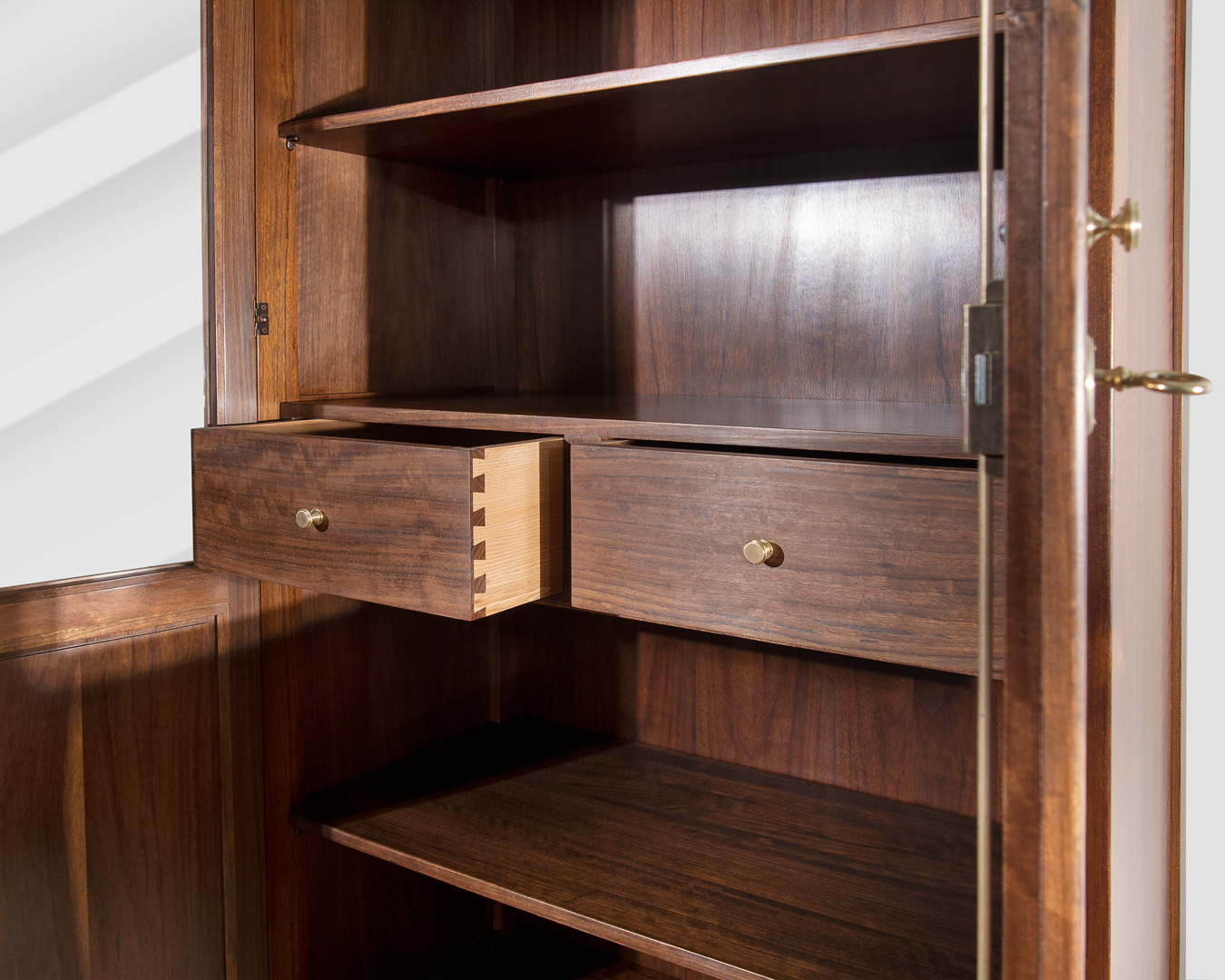 Vano interno con tre ripiani, regolabili in altezza e cassettiera con due cassetti, privi di maniglie, apribili tramite gole nascoste ricavate nella parte inferiore del frontale.