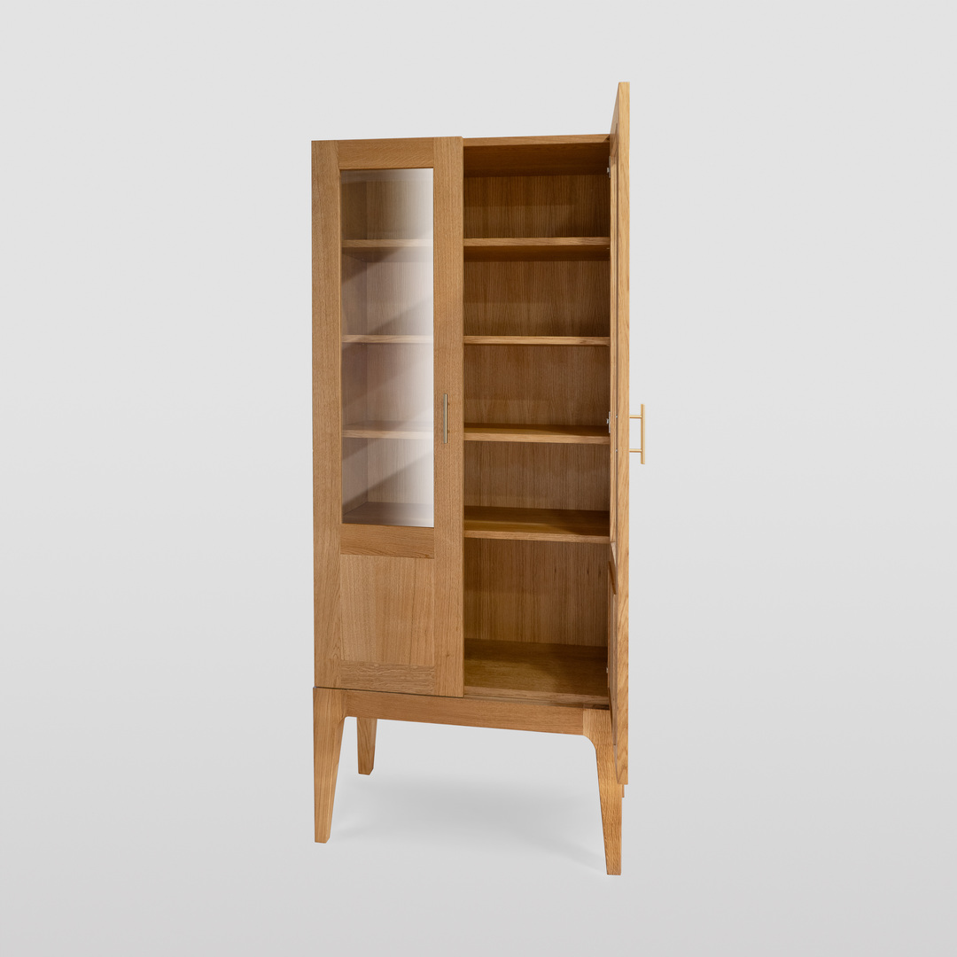 Le due ante, suddivise in una parte a vetro e una con pannello chiuso, creano un raffinato contrasto tra trasparenza e solidità, offrendo sia uno spazio espositivo per oggetti di valore che un'area discreta per riporre altri articoli. I quattro ripiani interni in legno assicurano una funzionalità ottimale per organizzare libri, servizi o decorazioni, rendendo questa vetrina un elemento d’arredo che unisce estetica e praticità.