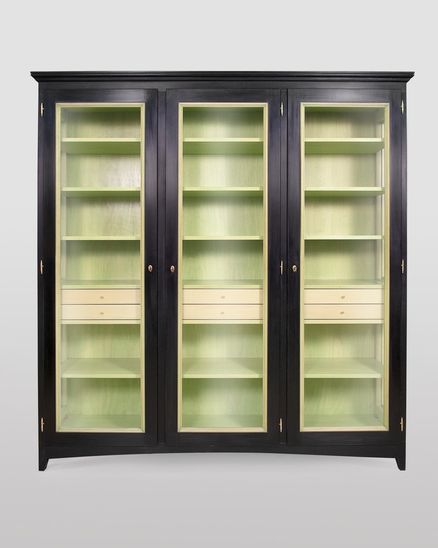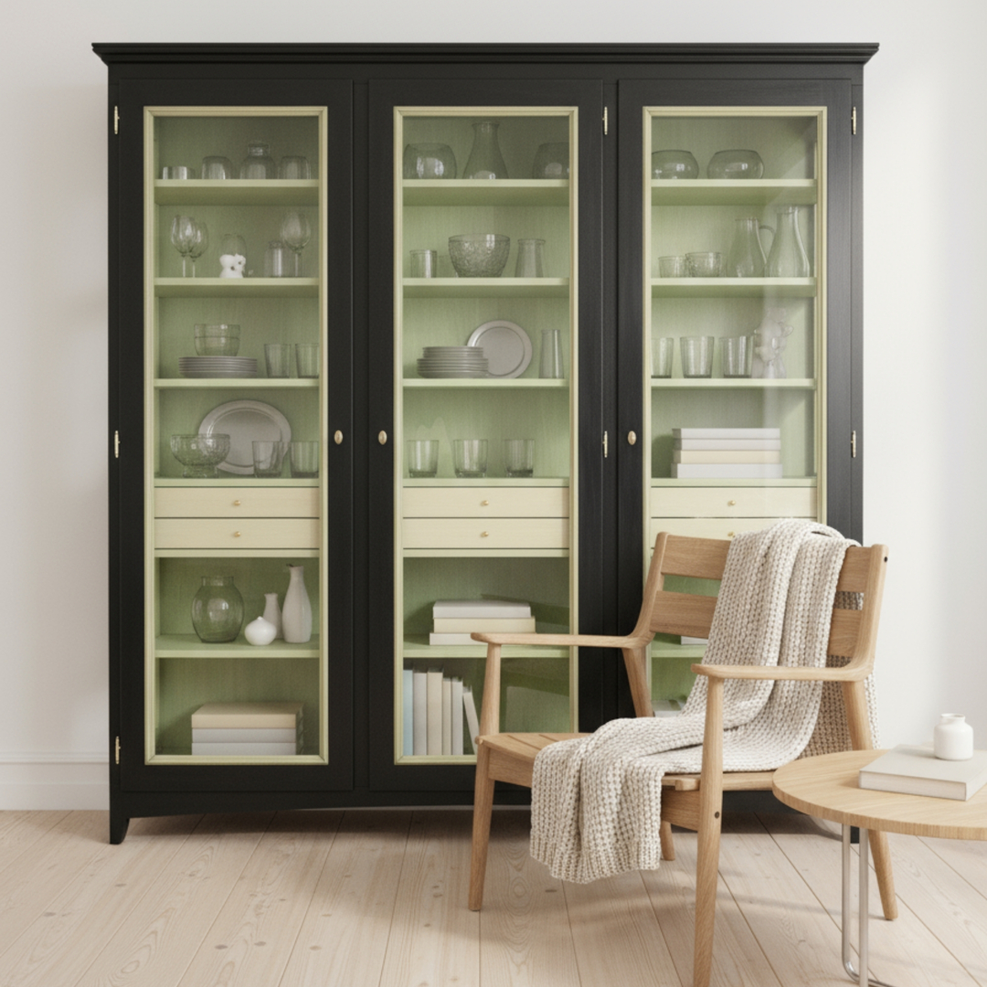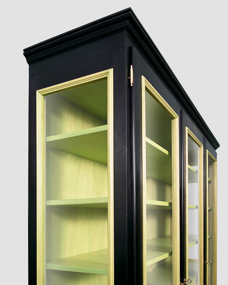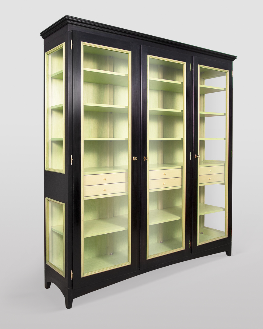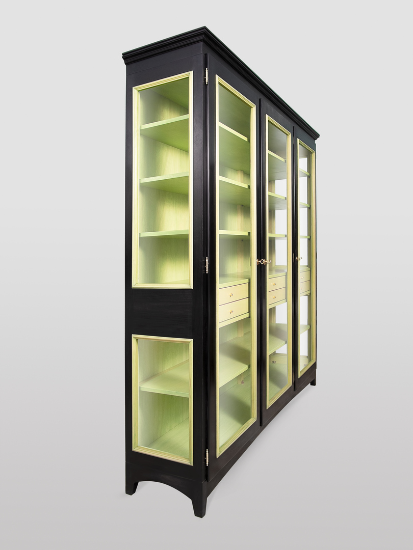 Verniciato con vernici ecologiche prive di emissioni tossiche nell'ambiente e lucidatura finale eseguita rigorosamente a mano con cera d'api, per donare un affascinante effetto satinato opaco alla vetrina.