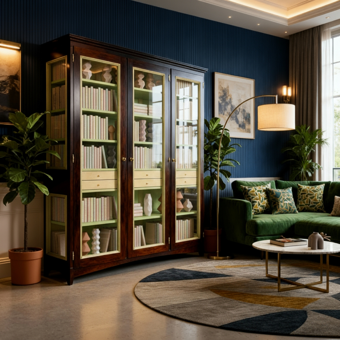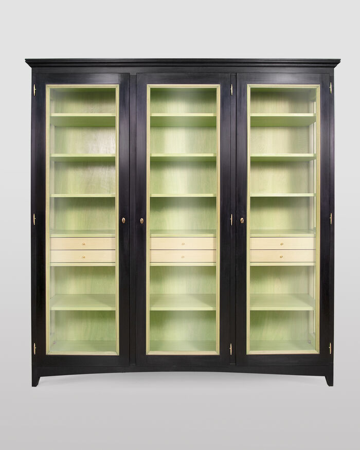 Stravagante vetrina a tre ante, dotata di tre ante e cassettiera interna con sei cassetti. Produzione interamente artigianale, realizzata con tecniche di alta ebanisteria. Fianchi con costruzione a telaio per aumentare la stabilità del mobile. Realizzata in vero legno massello di tiglio, incluse le mensole interne.