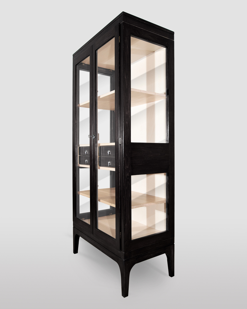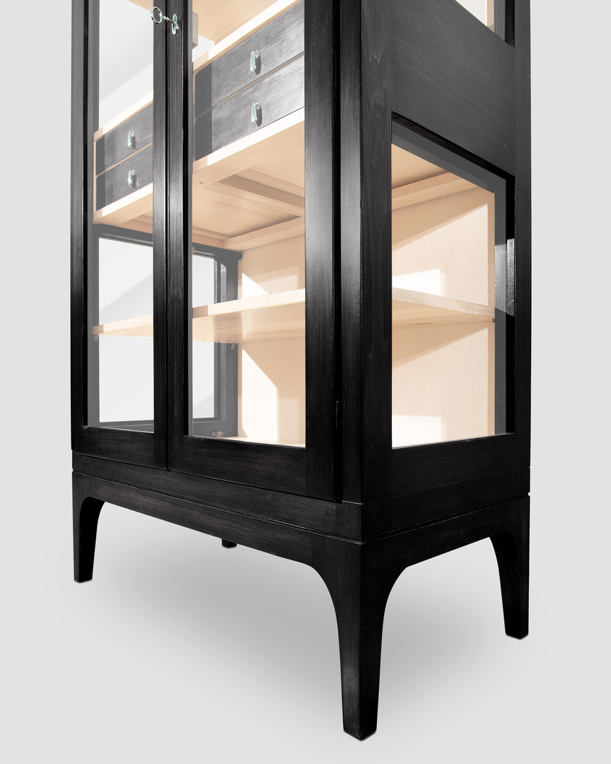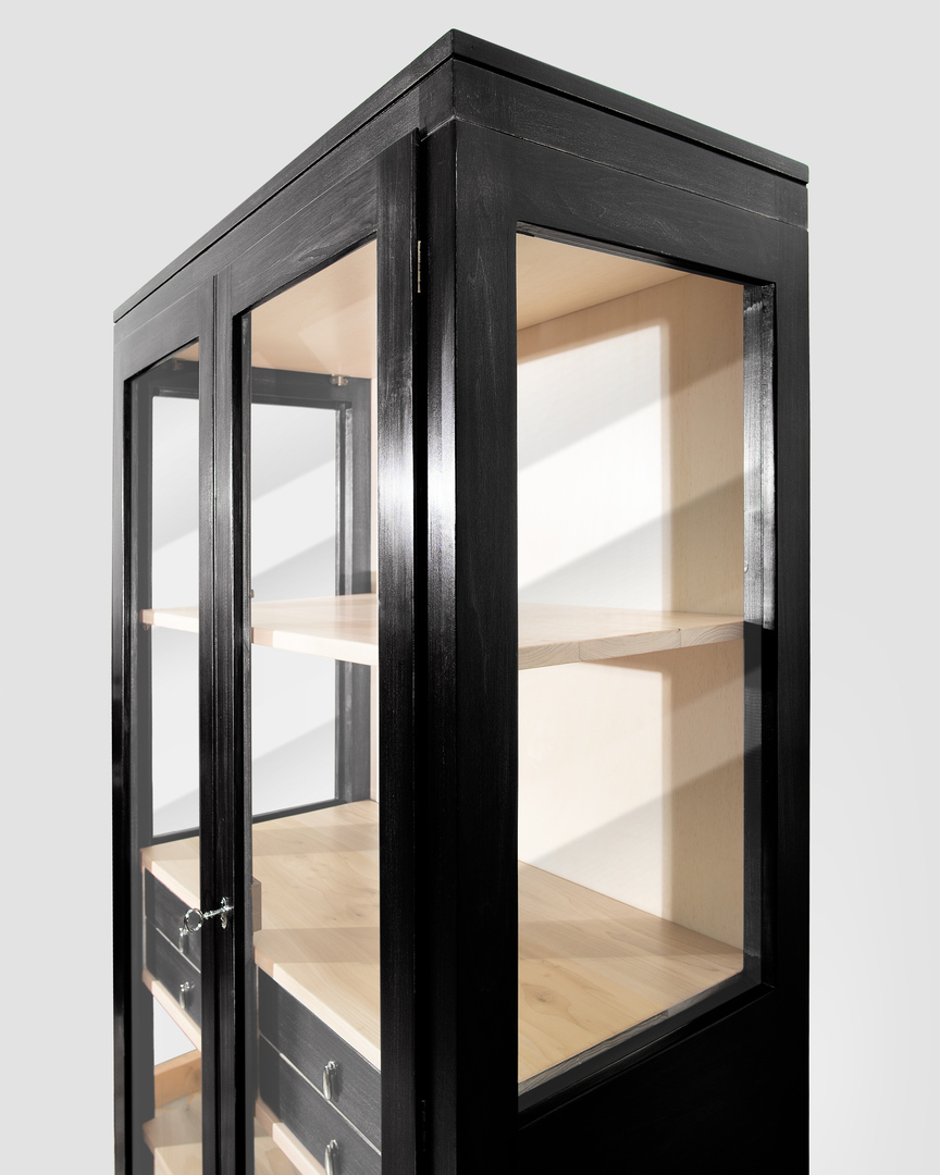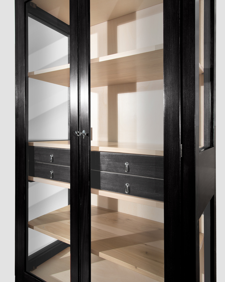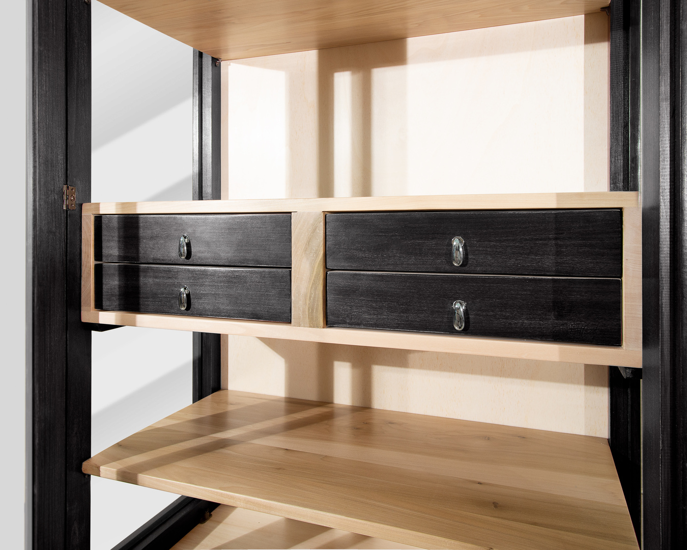 Finitura a contrasto, la parte esterna verniciata in colore nero, con tinta non coprente che lascia le venature a vista. La parte interna è in tiglio color naturale, volutamente ideata per ottenere un suggestivo contrasto cromatico.